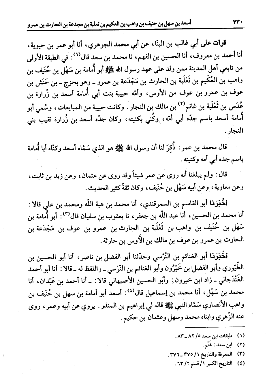 قرأت على أبي غالب بن البنا عن أبي محمد الجوهري أنا أبو عمر بن حيوية أنا أحمد بن معروف أنا الحسين بن الفهم نا محمد بن سعد قال في الطبقة الأولى من تابعي أهل المدينة ممن ولد على عهد رسول الله (صلى الله عليه وسلم) أبو أمامة بن سهل بن حنيف بن واهب بن العكيم بن ثعلبة بن الحارث بن مجدعة بن عمرو وهو بحزج بن حنش بن عوف بن عمرو بن عوف بن الأوس وأمه حبيبة بنت أبي أمامة أسعد بن زرارة بن عدس بن ثعلبة بن غانم (2) بن مالك بن النجار وكانت حبيبة من المبايعات وسمي أبو أمامة أسعد باسم جده أبي أمه وكني بكنيته وكان جده أسعد بن زرارة نقيب بني النجار قال محمد بن عمر ذكر لنا أن رسول الله (صلى الله عليه وسلم) هو الذي سماه أسعد وكناه أبا أمامة باسم جده أبي أمه وكنيته قال ولم يبلغنا أنه روى عن عمر شيئا وقد روى عن عثمان وعن زيد بن ثابت وعن معاوية وعن أبيه سهل بن حنيف وكان ثقة كثير الحديث أخبرنا أبو القاسم بن السمرقندي أنا محمد بن هبة الله ومحمد بن علي قالا أنا محمد بن الحسين أنا عبد الله بن جعفر نا يعقوب بن سفيان قال (3) أبو أمامة بن سهل بن حنيف بن واهب بن ثعلبة بن الحارث بن عمرو بن عوف بن مجدعة بن الحارث بن عمرو بن عوف بن مالك بن الأوس بن حارثة أخبرنا أبو الغنائم بن النرسي وحدثنا أبو الفضل بن ناصر أنا أبو الحسين بن الطيوري وأبو الفضل بن خيرون وأبو الغنائم بن النرسي واللفظ له قالا أنا أبو أحمد الغندجاني زاد ابن خيرون وأبو الحسين الأصبهاني قالا أنا أحمد بن عبدان أنا محمد بن سهل أنا محمد بن إسماعيل قال (4) أسعد أبو أمامة بن سهل بن حنيف بن واهب الأنصاري سماه النبي (صلى الله عليه وسلم) قاله لي إبراهيم بن المنذر يروي عن أبيه وعمر روى عنه الزهري وابناه محمد وسهل وعثمان بن حكيم