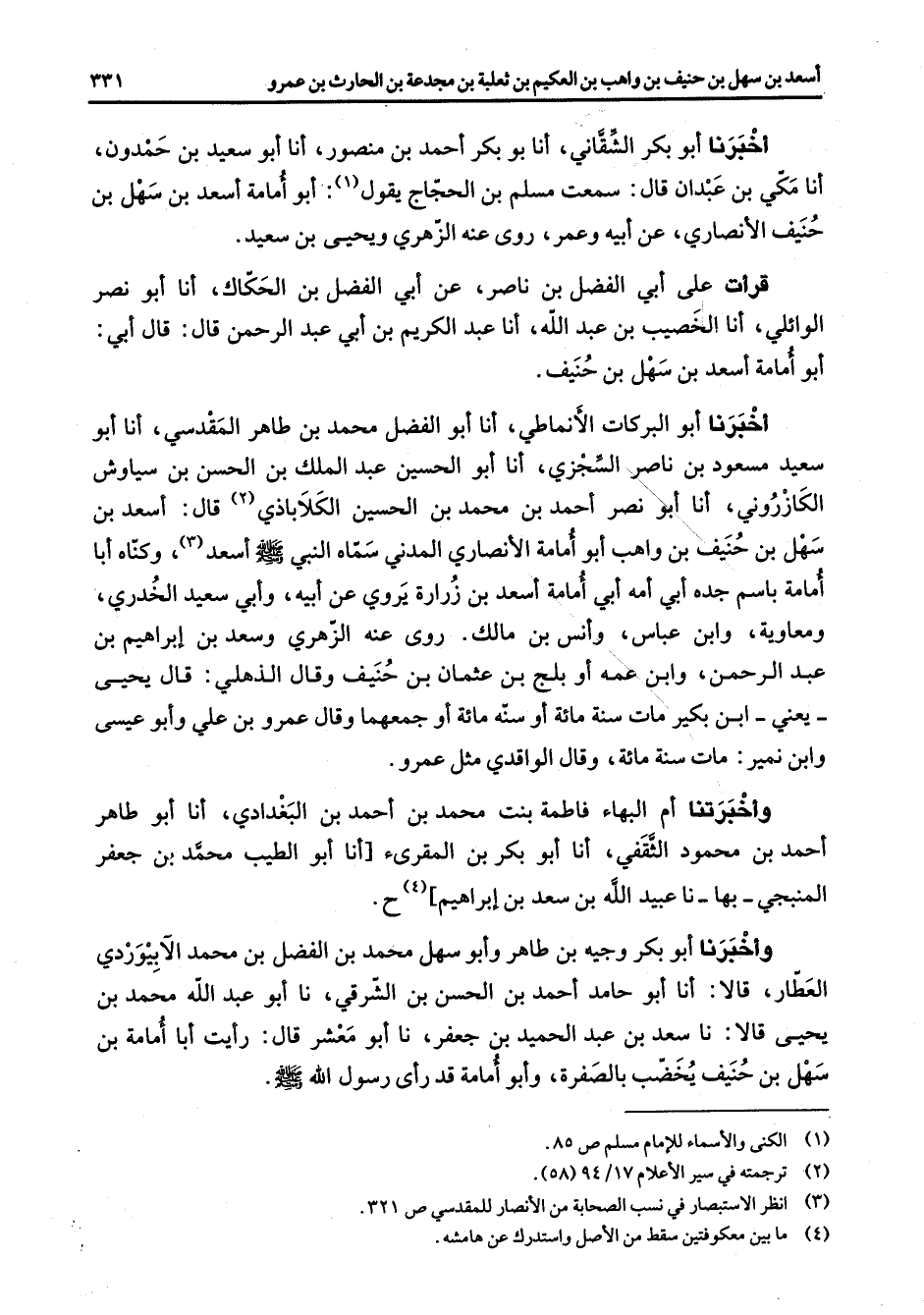 أخبرنا أبو بكر الشقاني أنا أبو بكر أحمد بن منصور أنا أبو سعيد بن حمدون أنا مكي بن عبدان قال سمعت مسلم بن الحجاج (1) يقول أبو أمامة أسعد بن سهل بن حنيف الأنصاري عن أبيه وعمر روى عنه الزهري ويحيى بن سعيد قرأت على أبي الفضل بن ناصر عن أبي الفضل بن الحكاك أنا أبو نصر الوائلي أنا الخصيب بن عبد الله أنا عبد الكريم بن أبي عبد الرحمن قال قال أبي أبو أمامة أسعد بن سهل بن حنيف أخبرنا أبو البركات الأنماطي أنا أبو الفضل محمد بن طاهر المقدسي أنا أبو سعيد مسعود بن ناصر السجزي أنا أبو الحسين عبد الملك بن الحسن بن سياوش الكازروني أنا أبو نصر أحمد بن محمد بن الحسين الكلاباذي (2) قال أسعد (3) بن سهل بن حنيف بن واهب أبو أمامة الأنصاري المدني سماه النبي (صلى الله عليه وسلم) أسعد وكناه أبا أمامة باسم جده أبي أمه أبي أمامة أسعد بن زرارة يروي عن أبيه وأبي سعيد الخدري ومعاوية وابن عباس وأنس بن مالك روى عنه الزهري وسعد بن إبراهيم بن عبد الرحمن وابن عمه أو بلج بن عثمان بن حنيف وقال الذهلي قال يحيى يعني ابن بكير مات سنة مائة أو سنه مائة أو جمعهما وقال عمر بن علي وأبو عيسى وابن نمير مات سنة مائة وقال الواقدي مثل عمرو وأخبرتنا أم البهاء فاطمة بنت محمد بن أحمد بن البغدادي أنا أبو طاهر أحمد بن محمود الثقفي أنا أبو بكر بن المقرئ أنا أبو الطيب محمد بن جعفر المنبجي بها نا عبيد الله بن سعد بن إبراهيم (4) وأخبرنا أبو بكر وجيه بن طاهر وأبو سهل محمد بن الفضل بن محمد الابيوردي العطار قالا أنا أبو حامد أحمد بن الحسن بن الشرقي نا أبو عبد الله محمد بن يحيى قالا نا سعد بن عبد الحميد بن جعفر نا أبو معشر قال رأيت أبا أمامة بن سهل بن حنيف يخضب بالصفرة وأبو أمامة قد رأى رسول الله (صلى الله عليه وسلم)