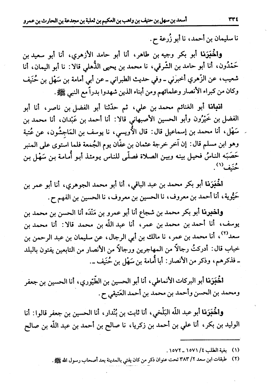 نا سليمان بن احمد نا أبو زرعة وأخبرنا أبو بكر وجيه بن طاهر أنا أبو حامد الأزهري أنا أبو سعيد بن حمدون أنا أبو حامد بن الشرقي نا محمد بن يحيى الذهلي قالا نا أبو اليمان أنا شعيب عن الزهري أخبرني وفي حديث الطبراني عن أبي أمامة بن سهل بن حنيف وكان من كبراء الأنصار وعلمائهم ومن أبناء الذين شهدوا بدرا مع النبي (صلى الله عليه وسلم) أنبأنا أبو الغنائم محمد بن علي ثم حدثنا أبو الفضل بن ناصر أنا أبو الفضل بن خيرون وأبو الحسين الأصبهاني قالا أنا أحمد بن عبدان أنا محمد بن إ سهل أنا محمد بن إسماعيل قال قال الأويسي نا يوسف بن الماجشون عن عتبة وهو ابن مسلم قال إن آخر خرجة عثمان بن عفان يوم الجمعة فلما استوى على المنبر حصبه الناس فحيل بينه وبين الصلاة فصلى للناس يومئذ أبو أمامة بن سهل بن حنيف (1) أخبرنا أبو بكر محمد بن عبد الباقي أنا أبو محمد الجوهري أنا أبو عمر بن حيوية أنا أحمد بن معروف نا الحسين بمعروف نا الحسين بن الفهم وأخبرنا أبو بكر محمد بن شجاع أنا أبو عمرو بن مندة أنا الحسن بن محمد بن يوسف أنا أحمد بن محمد بن عمر أنا عبد الله بن محمد قالا أنا محمد بن سعد (2) أنا محمد بن عمر نا مالك بن أبي الرجال عن سليمان بن عبد الرحمن بن خباب قال أدركت رجالا من المهاجرين ورجالا من الأنصار من التابعين يفتون بالبلد فذكرهم وذكر من الأنصار أبا أمامة بن سهل بن حنيف أخبرنا أبو البركات الأنماطي أنا أبو الحسين بن الطيوري أنا الحسين بن جعفر ومحمد بن الحسن وأحمد بن محمد بن أحمد العتيقي وأخبرنا أبو عبد الله البلخي أنا ثابت بن بندار أنا الحسين بن جعفر قالوا أنا الوليد بن بكر أنا علي بن أحمد بن زكريا نا صالح بن أحمد بن عبد الله بن صالح