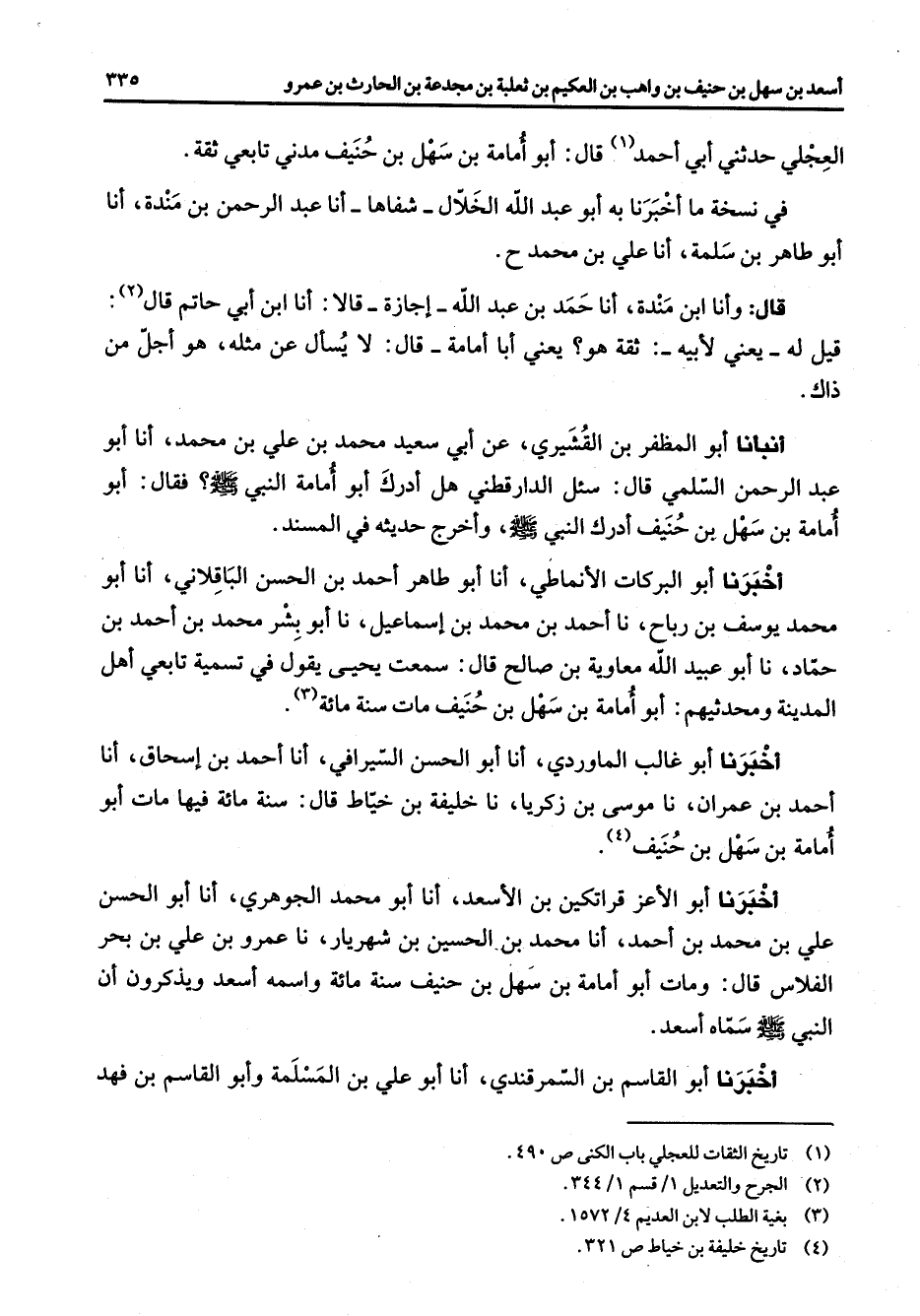 العجلي حدثني أبي أحمد (1) قال أبو أمامة بن سهل بن حنيف مدني تابعي ثقة في نسخة ما أخبرنا به أبو عبد الله الخلال شفاها أنا عبد الرحمن بن مندة أنا أبو طاهر بن سلمة أنا علي بن محمد قال وأنا ابن مندة أنا حمد بن عبد الله إجازة قالا أنا ابن أبي حاتم قال قيل له يعني لأبيه ثقة هو يعني أبا أمامة قال لا يسأل عن مثله هو أجل من إ ذاك أنبأنا أبو المظفر القشيري عن أبي سعيد محمد بن علي بن محمد أنا أبو إ عبد الرحمن السلمي قال سئل الدارقطني هل أدرك أبو أمامة النبي (صلى الله عليه وسلم) فقال أبو أمامة بن سهل بن حنيف أدرك النبي (صلى الله عليه وسلم) وأخرج حديثه في - المسند - أخبرنا أبو البركات الأنماطي أنا أبو طاهر أحمد بن الحسن الباقلاني أنا أبو محمد يوسف بن رباح نا أحمد بن محمد بن إسماعيل نا أبو بشر محمد بن أحمد بن حماد نا أبو عبيد الله معاوية بن صالح قال سمعت يحيى يقول في تسمية تابعي أهل المدينة ومحدثيهم أبو أمامة بن سهل بن حنيف مات سنة مائة (3) أخبرنا أبو غالب الماوردي أنا أبو الحسن السيرافي أنا أحمد بن إسحاق أنا أحمد بن عمران نا موسى بن زكريا نا خليفة بن خياط قال سنة مائة فيها مات أبو أمامة سهل بن حنيف (4) أخبرنا أبو الأعز قراتكين بن الأسعد أنا أبو محمد الجوهري أنا أبو الحسن إ علي بن محمد بن أحمد أنا محمد بن الحسين بن شهريار نا عمرو بن علي بن بحر الفلاس قال ومات أبو أمامة بن سهل بن حنيف سنة مائة واسمه أسعد ويذكرون أن النبي (صلى الله عليه وسلم) سماه أسعد أخبرنا أبو القاسم بن السمرقندي أنا أبو علي بن المسلمة وأبو القاسم بن فهد