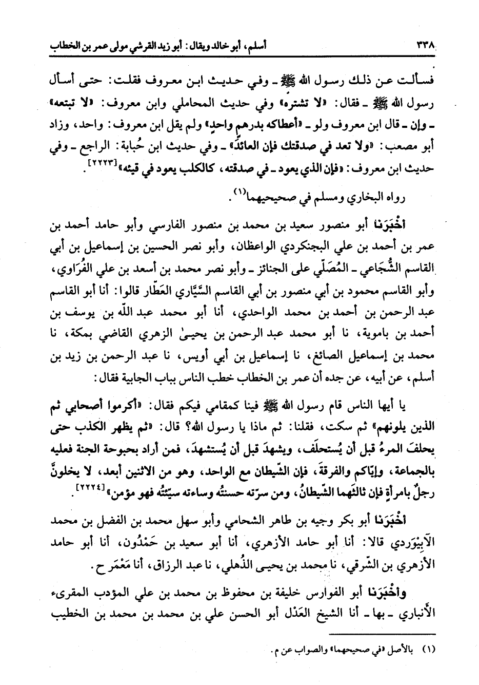 [2223] رواه البخاري ومسلم في - صحيحيهما - (1) أخبرنا أبو منصور سعيد بن محمد بن منصور الفارسي وأبو حامد أحمد بن عمر بن أحمد بن علي البجنكردي الواعظان وأبو نصر الحسين بن إسماعيل بن أبي القاسم الشجاعى المصلي على الجنائز وأبو نصر محمد بن أسعد بن علي الفراوي وأبو القاسم محمود بن أبي منصور بن أبي القاسم السياري العطار قالوا أنا أبو القاسم عبد الرحمن بن أحمد بن محمد الواحدي أنا أبو محمد عبد الله بن يوسف بن أحمد بن باموية نا أبو محمد عبد الرحمن بن يحيى الزهري القاضي بمكة نا محمد بن إسماعيل الصائغ نا إسماعيل بن أبي أويس نا عبد الرحمن بن زيد بن أسلم عن أبيه عن جده أن عمر بن الخطاب خطب الناس بباب الجابية فقال يا أيها الناس قام رسول الله (صلى الله عليه وسلم) فينا كمقامي فيكم فقال أكرموا أصحابي ثم الذين يلونهم ثم سكت فقلنا ثم ماذا يا رسول الله قال ثم يظهر الكذب حتى يحلف المرء قبل أن يستحلف ويشهد قبل أن يستشهد فمن أراد بحبوحة الجنة فعليه بالجماعة وإياكم والفرقة فإن الشيطان مع الواحد وهو من الاثنين أبعد لا يخلون رجل بامرأة فإن ثالثهما الشيطان ومن سرته حسنته وساءته سيئته فهو مؤمن