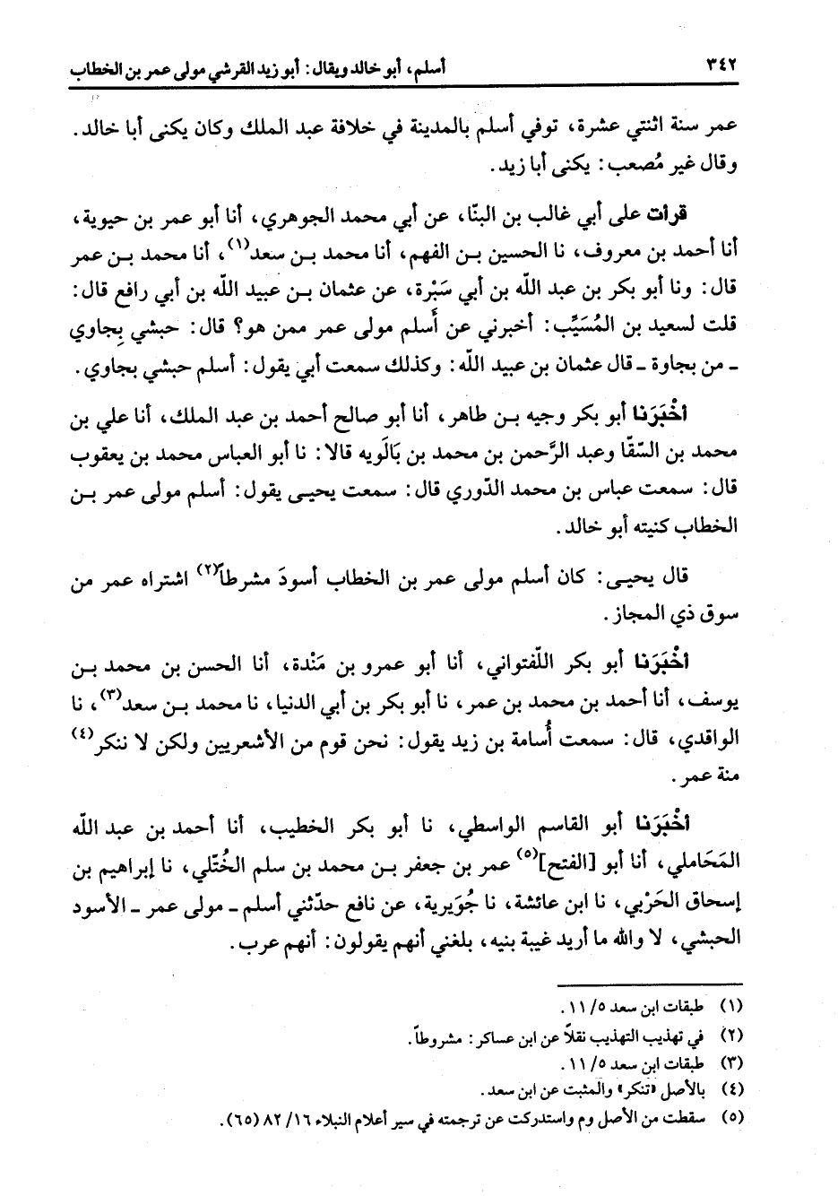 عمر سنة اثنتي عشرة توفي أسلم بالمدينة في خلافة عبد الملك وكان يكنى أبا خالد وقال غير مصعب يكنى أبا زيد قرأت على أبي غالب بن البنا عن أبي محمد الجوهري أنا أبو عمر بن حيوية أنا أحمد بن معروف نا الحسين بن الفهم أنا محمد بن سعد أنا محمد بن عمر قال ونا أبو بكر بن عبد الله بن أبي سبرة عن عثمان بن عبيد الله بن أبي رافع قال قلت لسعيد بن المسيب أخبرني عن أسلم مولى عمر ممن هو قال حبشي بجاوي من بجاوة قال عثمان بن عبيد الله وكذلك سمعت أبي يقول أسلم حبشي بجاوي أخبرنا أبو بكر وجيه بن طاهر أنا أبو صالح أحمد بن عبد الملك أنا علي بن محمد بن السقا وعبد الرحمن بن محمد بن بالويه قالا نا أبو العباس محمد بن يعقوب قال سمعت عباس بن محمد الدوري قال سمعت يحيى يقول أسلم مولى عمر بن الخطاب كنيته أبو خالد قال يحيى كان أسلم مولى عمر بن الخطاب أسود مشرطا اشتراه عمر من سوق ذي المجاز أخبرنا أبو بكر اللفتواني أنا أبو عمرو بن مندة أنا الحسن بن محمد بن يوسف أنا أحمد بن محمد بن عمر نا أبو بكر بن أبي الدنيا نا محمد بن سعد نا الواقدي قال سمعت أسامة بن زيد يقول نحن قوم من الأشعريين ولكن لا ننكر منه عمر أخبرنا أبو القاسم الواسطي نا أبو بكر الخطيب أنا أحمد بن عبد الله المحاملي أنا أبو الفتح (5) عمر بن جعفر بن محمد بن سلم الختلي نا إبراهيم بن إسحاق الحربي نا ابن عائشة نا جويرية عن نافع حدثني أسلم مولى عمر الأسود الحبشي لا والله ما أريد غيبة بنيه بلغني أنهم يقولون أنهم عرب