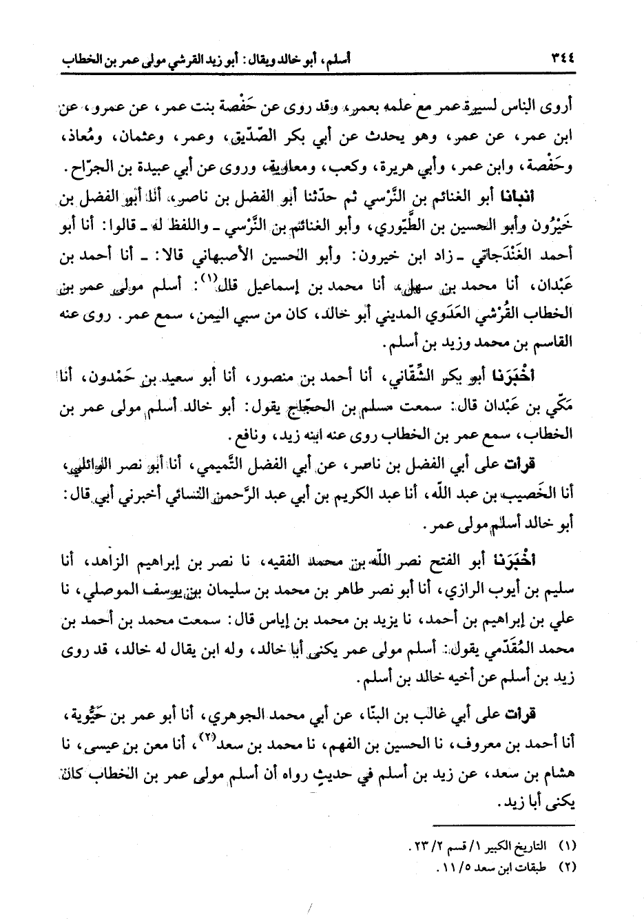 أروى الناس لسيرة عمر مع علمه بعمر وقد روى عن حفصة بنت عمر عن عمرو عن ابن عمر عن عمر وهو يحدث عن أبي بكر الصديق وعمر وعثمان ومعاذ وحفصة وابن عمر وأبي هريرة وكعب ومعاوية وروى عن أبي عبيدة بن الجراح أنبأنا أبو الغنائم بن النرسي ثم حدثنا أبو الفضل بن ناصر أنا أبو الفضل بن خيرون وأبو الحسين بن الطيوري وأبو الغنائم بن النرسي واللفظ له قالوا أن أبو أحمد الغندجاني زاد ابن خيرون وأبو الحسين الأصبهاني قالا أنا أحمد بن عبدان أنا محمد بن سهل أنا محمد بن إسماعيل قال (1) أسلم مولى عمر بن الخطاب القرشي العدوي المديني أبو خالد كان من سبي اليمن سمع عمر روى عنه القاسم بن محمد وزيد بن أسلم أخبرنا أبو بكر الشقاني أنا أحمد بن منصور أنا أبو سعيد بن حمدون أنا مكي بن عبدان قال سمعت مسلم بن الحجاج يقول أبو خالد أسلم مولى عمر بن الخطاب سمع عمر بن الخطاب روى عنه ابنه زيد ونافع قرأت على أبي الفضل بن ناصر عن أبي الفضل التميمي أنا أبو نصر الوائلي أنا الخصيب بن عبد الله أنا عبد الكريم بن أبي عبد الرحمن النسائي أخبرني أبي قال أبو خالد أسلم مولى عمر أخبرنا أبو الفتح نصر الله بن محمد الفقيه نا نصر بن إبراهيم الزاهد أنا سليم بن أيوب الرازي أنا أبو نصر طاهر بن محمد بن سليمان بن يوسف الموصلي نا علي بن إبراهيم بن أحمد نا يزيد بن محمد بن إياس قال سمعت محمد بن أحمد بن محمد المقدمي يقول أسلم مولى عمر يكنى أبا خالد وله ابن يقال له خالد قد روى زيد بن أسلم عن أخيه خالد بن أسلم قرأت على أبي غالب بن البنا عن أبي محمد الجوهري أنا أبو عمر بن حيوية أنا أحمد بن معروف نا الحسين بن الفهم نا محمد بن سعد أنا معن بن عيسى نا هشام بن سعد عن زيد بن أسلم في حديث رواه أن أسلم مولى عمر بن الخطاب كان يكنى أبا زيد
