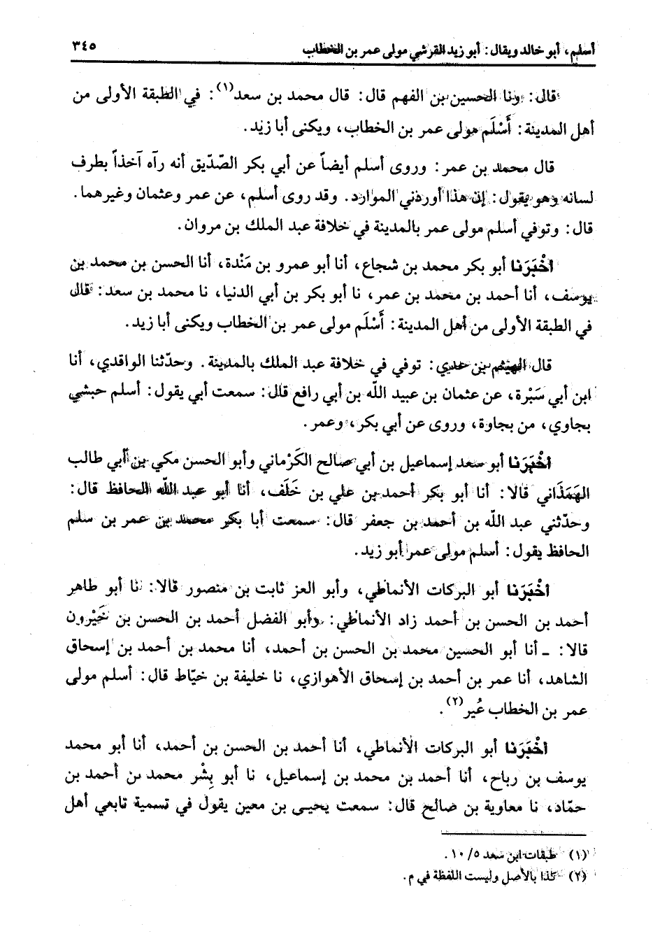 قال ونا الحسين بن الفهم قال قال محمد بن سعد في الطبقة الأولى من أهل المدينة أسلم مولى عمر بن الخطاب ويكنى أبا زيد قال محمد بن عمر وروى أسلم أيضا عن أبي بكر الصديق أنه رآه آخذا بطرف لسانه وهو يقول إن هذا أوردني الموارد وقد روى أسلم عن عمر وعثمان وغيرهما قال وتوفي أسلم مولى عمر بالمدينة في خلافة عبد الملك بن مروان أخبرنا أبو بكر محمد بن شجاع أنا أبو عمرو بن مندة أنا الحسن بن محمد بن يوسف أنا أحمد بن محمد بن عمر نا أبو بكر بن أبي الدنيا نا محمد بن سعد قال في الطبقة الأولى من أهل المدينة أسلم مولى عمر بن الخطاب ويكنى أبا زيد قال الهيثم بن عدي توفي في خلافة عبد الملك بالمدينة وحدثنا الواقدي أنا ابن أبي سبرة عن عثمان بن عبيد الله بن أبي رافع قال سمعت أبي يقول أسلم حبشي بجاوي من بجاوة وروى عن أبي بكر وعمر أخبرنا أبو سعد إسماعيل بن أبي صالح الكرماني وأبو الحسن مكي بن أبي طالب الهمذاني قالا أنا أبو بكر أحمد بن علي بن خلف أنا أبو عبد الله الحافظ قال وحدثني عبد الله بن أحمد بن جعفر قال سمعت أبا بكر محمد بن عمر بن سلم الحافظ يقول أسلم مولى عمر أبو زيد أخبرنا أبو البركات الأنماطي وأبو العز ثابت بن منصور قالا نا أبو طاهر أحمد بن الحسن بن أحمد زاد الأنماطي وأبو الفضل أحمد بن الحسن بن خيرون قالا أنا أبو الحسين محمد بن الحسن بن أحمد أنا محمد بن أحمد بن إسحاق الشاهد أنا عمر بن أحمد بن إسحاق الأهوازي نا خليفة بن خياط قال أسلم مولى عمر بن الخطاب عير (2) أخبرنا أبو البركات الأنماطي أنا أحمد بن الحسن بن أحمد أنا أبو محمد يوسف بن رباح أنا أحمد بن محمد بن إسماعيل نا أبو بشر محمد بن أحمد بن حماد نا معاوية بصالح قال سمعت يحيى بن معين يقول في تسمية تابعي أهل