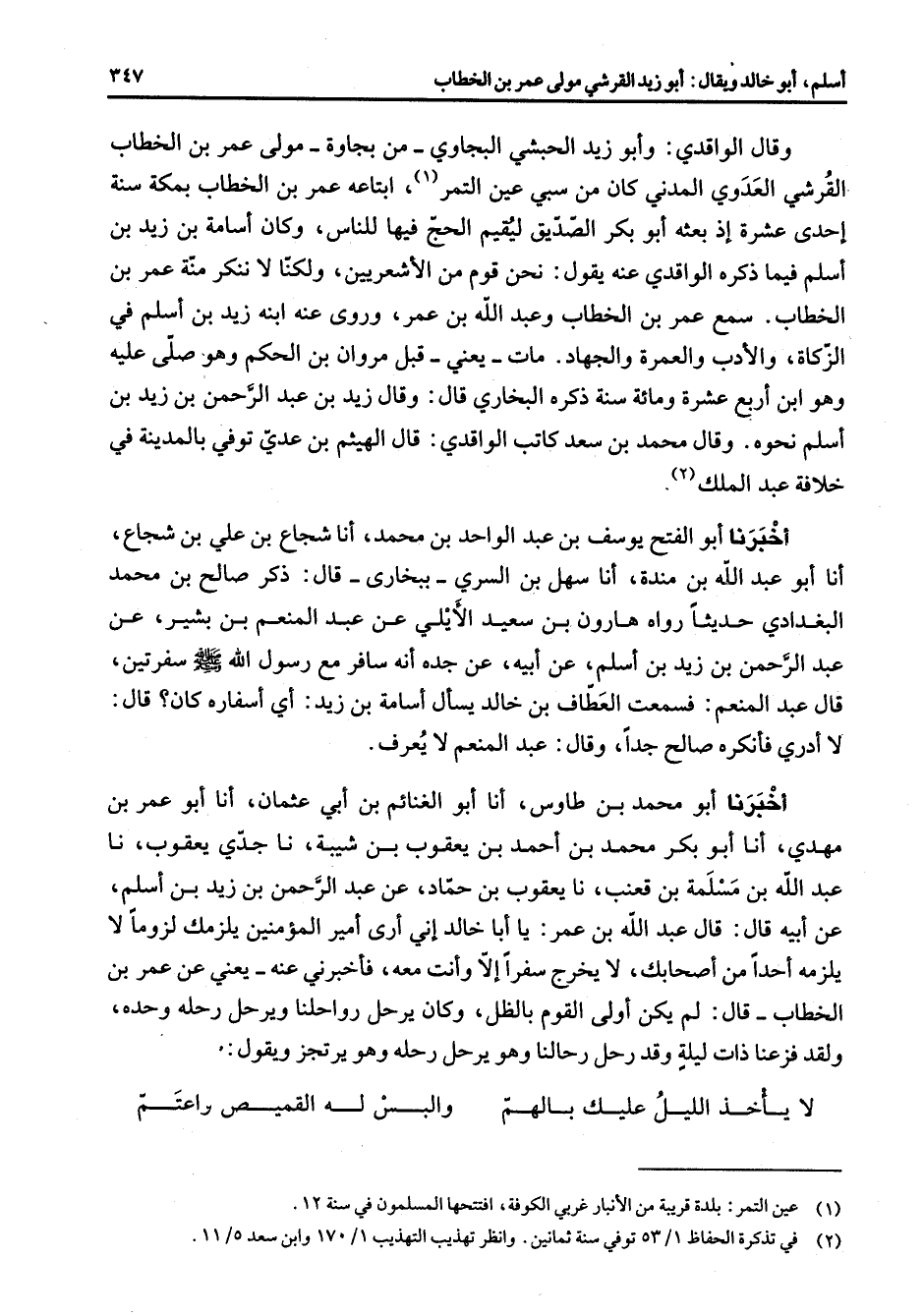 وقال الواقدي وأبو زيد الحبشي البجاوي من بجاوة مولى عمر بن الخطاب القرشي العدوي المدني كان من سبى عين التمر (1) ابتاعه عمر بن الخطاب بمكة سنة إحدى عشرة إذ بعثه أبو بكر الصديق ليقيم الحج فيها للناس وكان أسامة بن زيد بن أسلم فيما ذكره الواقدي عنه يقول نحن قوم من الأشعريين ولكنا لا ننكر منة عمر بن الخطاب سمع عمر بن الخطاب وعبد الله بن عمر وروى عنه ابنه زيد بن أسلم في الزكاة والأدب والعمرة والجهاد مات يعني قبل مروان بن الحكم وهو صلى عليه وهو ابن أربع عشرة ومائة سنة ذكره البخاري قال وقال زيد بن عبد الرحمن بن زيد بن أسلم نحوه وقال محمد بن سعد كاتب الواقدي قال الهيثم بن عدي توفي بالمدينة في خلافة عبد الملك (2) أخبرنا أبو الفتح يوسف بن عبد الواحد بن محمد أنا شجاع بن علي بن شجاع أنا أبو عبد الله بن مندة أنا سهل بن السري ببخارى قال ذكر صالح بن محمد البغدادي حديثا رواه هارون بن سعيد الأيلي عن عبد المنعم بن بشير عن عبد الرحمن بن زيد بن أسلم عن أبيه عن جده أنه سافر مع رسول الله (صلى الله عليه وسلم) سفرتين قال عبد المنعم فسمعت العطاف بن خالد يسأل أسامة بن زيد أي أسفاره كان قال لا أدري فأنكره صالح جدا وقال عبد المنعم لا يعرف أخبرنا أبو محمد بن طاوس أنا أبو الغنائم بن أبي عثمان أنا أبو عمر بن مهدي أنا أبو بكر محمد بن أحمد بن يعقوب بن شيبة نا جدي يعقوب نا عبد الله بن مسلمة بن قعنب نا يعقوب بن حماد عن عبد الرحمن بن زيد بن أسلم عن أبيه قال قال عبد الله بن عمر يا أبا خالد إني أرى أمير المؤمنين يلزمك لزوما لا يلزمه أحدا من أصحابك لا يخرج سفرا إلا وأنت معه فأخبرني عنه يعني عن عمر بن الخطاب قال لم يكن أولى القوم بالظل وكان يرحل رواحلنا ويرحل رحله وحده ولقد فزعنا ذات ليلة وقد رحل رحالنا وهو يرحل رحله وهو يرتجز ويقول * لا يأخذ الليل عليك بالهم * والبس له القميص واعتم