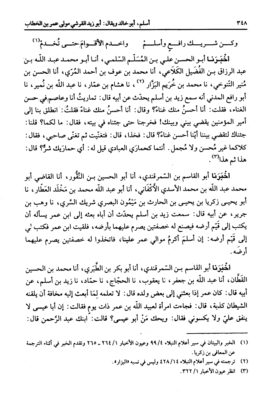 وكن شريك رافع وأسلم * واخدم الأقوام حتى تخدم (1) * أخبرنا أبو الحسن علي بن المسلم السلمي أنا أبو محمد عبد الله بن عبد الرزاق بن الفضيل الكلاعي أنا محمد بن عوف بن أحمد المري أنا الحسن بن منير التنوخي نا محمد بن خريم البزار (2) نا هشام بن عمار نا عبد الله بن نمير نا أبو رافع المدني أنه سمع زيد بن أسلم يحدث عن أبيه قال تماريت أنا وعاصم في حسن الغناء فقلت أنا أحسن منك غناء وقال أنا أحسن منك غناء فقلت انطلق بنا إلى أمير المؤمنين يقضي بيني وبينك فخرجنا حتى جئناه في بيته فقال ما لكما قلنا جئناك لتقضي بيننا أينا أحسن غناء فخذا قال فتغنيت ثم تغنى صاحبي فقال كلاكما غير محسن ولا مجمل أنتما كحماري العبادي قيل له أي حماريك شر قال هذا ثم هذا (3) أخبرنا أبو القاسم بن السمرقندي أنا أبو الحسين بن النقور أنا القاضي أبو محمد عبد الله بن محمد الأسدي الأكفاني أنا أبو عبد الله محمد بن مخلد العطار نا أبو يحيى زكريا بن يحيى بن الحارث بن ميمون البصري شريك السري نا وهب بن جرير عن أبيه قال سمعت زيد بن أسلم يحدث أن أباه بعثه إلى ابن عمر يسأله أن يكتب إلى قيم أرضه فيصنع له خصفتين يصرم عليهما بأرضه فلقيت ابن عمر فكتب لي إلى قيم أرضه إن أسلم أكرم موالي عمر علينا فاتخذوا له خصفتين يصرم عليهما أرضه أخبرنا أبو القاسم بن السمرقندي أنا أبو بكر بن الطبري أنا محمد بن الحسين القطان أنا عبد الله بن جعفر نا يعقوب نا الحجاج نا حماد نا زيد بن أسلم عن أبيه قال كان عمر إذا بعثني إلى بعض ولده قال لا تعلمه لما أبعث إليه مخافة أن يلقنه الشيطان كذبه قال فجاءت امرأة لعبيد الله بن عمر ذات يوم فقالت إن أبا عيسى لا ينفق علي ولا يكسوني فقال ويحك من أبو عيسى قالت ابنك عبد الرحمن قال