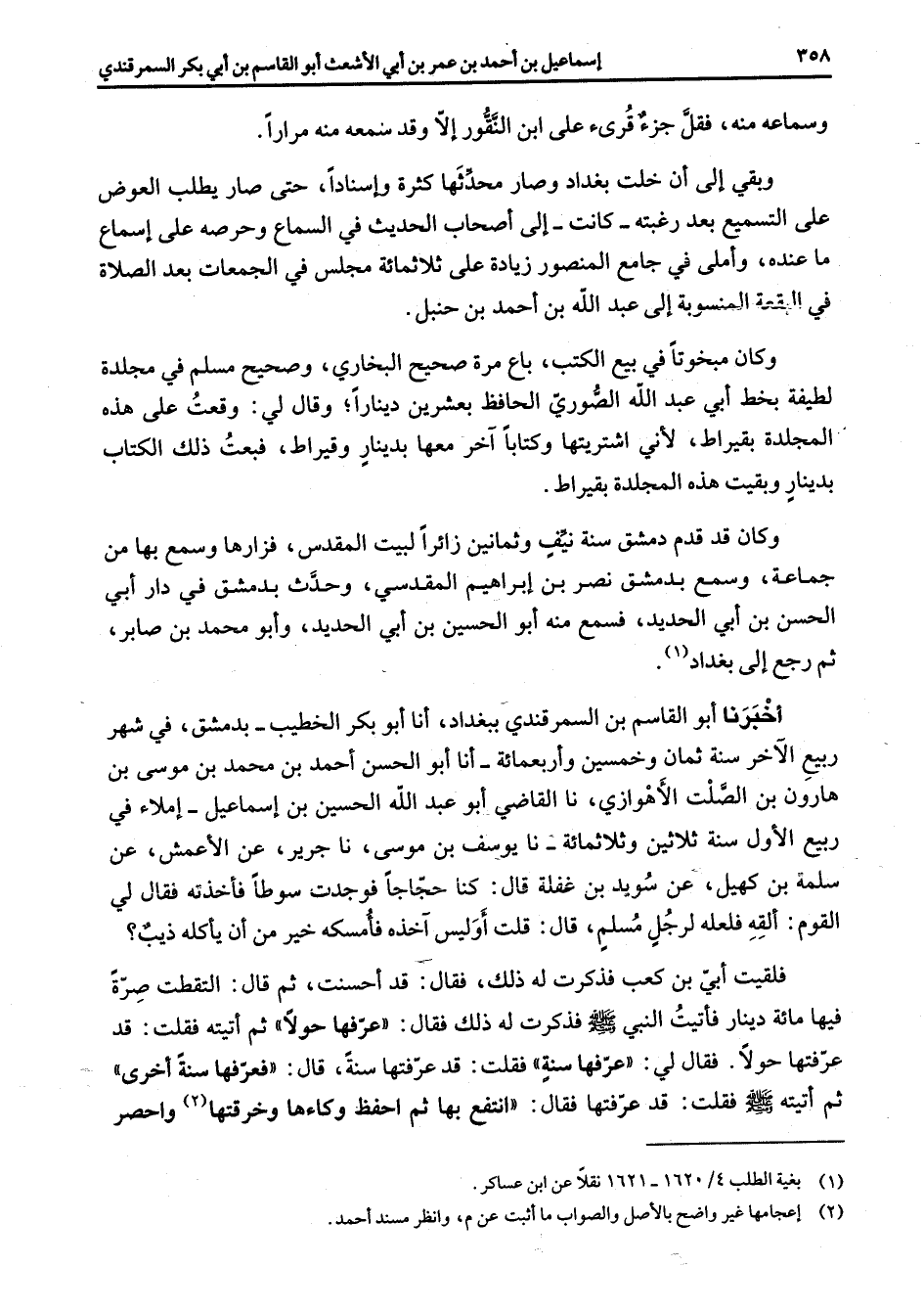 وسماعه منه فقل جزء قرئ على ابن النقور إلا وقد سمعه منه مرارا وبقي إلى أن خلت بغداد وصار محدثها كثرة وإسنادا حتى صار يطلب العوض على التسميع بعد رغبته كانت إلى أصحاب الحديث في السماع وحرصه على إسماع ما عنده وأملى في جامع المنصور زيادة على ثلاثمائة مجلس في الجمعات بعد الصلاة في البقعة المنسوبة إلى عبد الله بن أحمد بن حنبل وكان مبخوتا في بيع الكتب باع مرة - صحيح البخاري - و - صحيح مسلم - في مجلدة لطيفة بخط أبي عبد الله الصوري الحافظ بعشرين دينارا وقال لي وقعت على هذه المجلدة بقيراط لأني اشتريتها كتابا آخر معها بدينار وقيراط فبعت ذلك الكتاب بدينار وبقيت هذه المجلدة بقيراط وكان قد قدم دمشق سنة نيف وثمانين زائرا لبيت المقدس فزارها وسمع بها من جماعة وسمع بدمشق نصر بن إبراهيم المقدسي وحدث بدمشق في دار أبي الحسن بن أبي الحديد فسمع منه أبو الحسين بن أبي الحديد وأبو محمد بن صابر ثم رجع إلى بغداد (1) أخبرنا أبو القاسم بن السمرقندي ببغداد أنا أبو بكر الخطيب بدمشق في شهر ربيع الآخر سنة ثمان وخمسين وأربعمائة أنا أبو الحسن أحمد بن محمد بن موسى بن هارون بن الصلت الأهوازي نا القاضي أبو عبد الله الحسين بن إسماعيل إملاء في ربيع الأول سنة ثلاثين وثلاثمائة نا يوسف بن موسى نا جرير عن الأعمش عن سلمة بن كهيل عن سويد بن غفلة قال كنا حجاجا فوجدت سوطا فأخذته فقال لي القوم ألقه فلعله لرجل مسلم قال قلت أو ليس آخذه فأمسكه خير من أن يأكله ذيب فلقيت أبي بن كعب فذكرت له ذلك فقال قد أحسنت ثم قال التقطت صرة فيها مائة دينار فأتيت النبي (صلى الله عليه وسلم) فذكرت له ذلك فقال عرفها حولا ثم أتيته فقلت قد عرفتها حولا فقال لي عرفها سنة فقلت قد عرفتها سنة قال فعرفها سنة أخرى ثم أتيته (صلى الله عليه وسلم) فقلت قد عرفتها فقال انتفع بها ثم احفظ وكاءها وخرقتها (2) واحصر