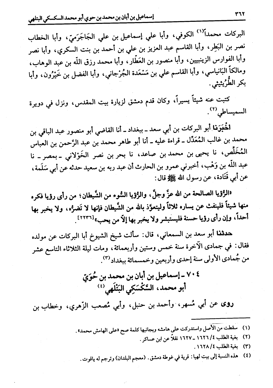 البركات محمدا (1) الكوفي وأبا علي إسماعيل بن علي الجاجرمي وأبا الخطاب نصر بن البطر وأبا القاسم عبد العزيز بن علي بن أحمد بن بنت السكري وأبا نصر وأبا الفوارس الزينبيين وأبا منصور بن العطار وأبا محمد رزق الله بن عبد الوهاب ومالكا البانياسي وأبا القاسم علي بن مسعدة الجرجاني وأبو الفضل بن خيرون وأبا بكر الطريثيثي كتبت عنه شيئا يسيرا وكان قدم دمشق لزيارة بيت المقدس ونزل في دويرة السميساطي (2) أخبرنا أبو البركات بن أبي سعد ببغداد أنا القاضي أبو منصور عبد الباقي بن محمد بن غالب المعدل قراءة عليه أنا أبو طاهر محمد بن عبد الرحمن بن العباس المخلص نا يحيى بن محمد بن صاعد نا بحربن نصر الخولاني بمصر نا عبد الله بن وهب أخبرني عمرو بن الحارث أن عبد ربه بسعيد حدثه عن أبي سلمة عن أبي قتادة عن رسول الله (صلى الله عليه وسلم) قال الرؤيا الصالحة من الله عز وجل والرؤيا السوء من الشيطان ومن رأى رؤيا فكره منها شيئا فلينفث عن يساره ثلاثا وليتعوذ بالله من الشيطان فإنها لا تضره ولا يخبر بها أحدا وإن رأى رؤيا حسنة فليستبشر ولا يخبر بها إلا من يحب