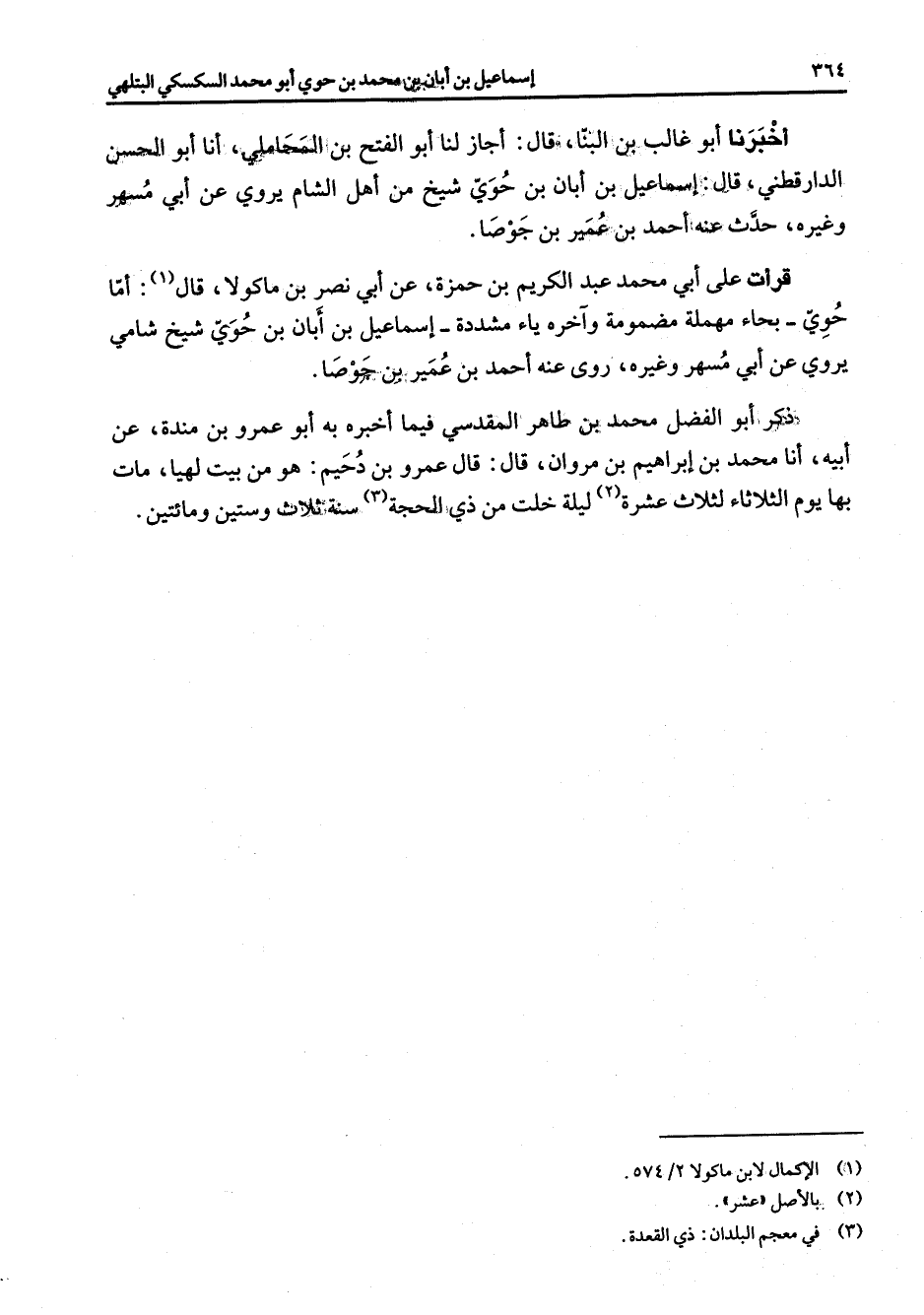 أخبرنا أبو غالب بن البنا قال أجاز لنا أبو الفتح بن المحاملي أنا أبو الحسن الدارقطني قال إسماعيل بن أبان بن حوي شيخ من أهل الشام يروي عن أبي مسهر وغيره حدث عنه أحمد بن عمير بن جوصا قرأت على أبي محمد عبد الكريم بن حمزة عن أبي نصر بن ماكولا قال (1) أما حوي بحاء مهملة مضمومة وآخره ياء مشددة إسماعيل بن أبان بن حوي شيخ شامي يروي عن أبي مسهر وغيره روى عنه أحمد بن عمير بن جوصا ذكر أبو الفضل محمد بن طاهر المقدسي فيما أخبره به أبو عمرو بن مندة عن أبيه أنا محمد بن إبراهيم بن مروان قال قال عمرو بن دحيم هو من بيت لهيا مات بها يوم الثلاثاء لثلاث عشرة (2) ليلة خلت من ذي الحجة (3) سنة ثلاث وستين ومائتين "