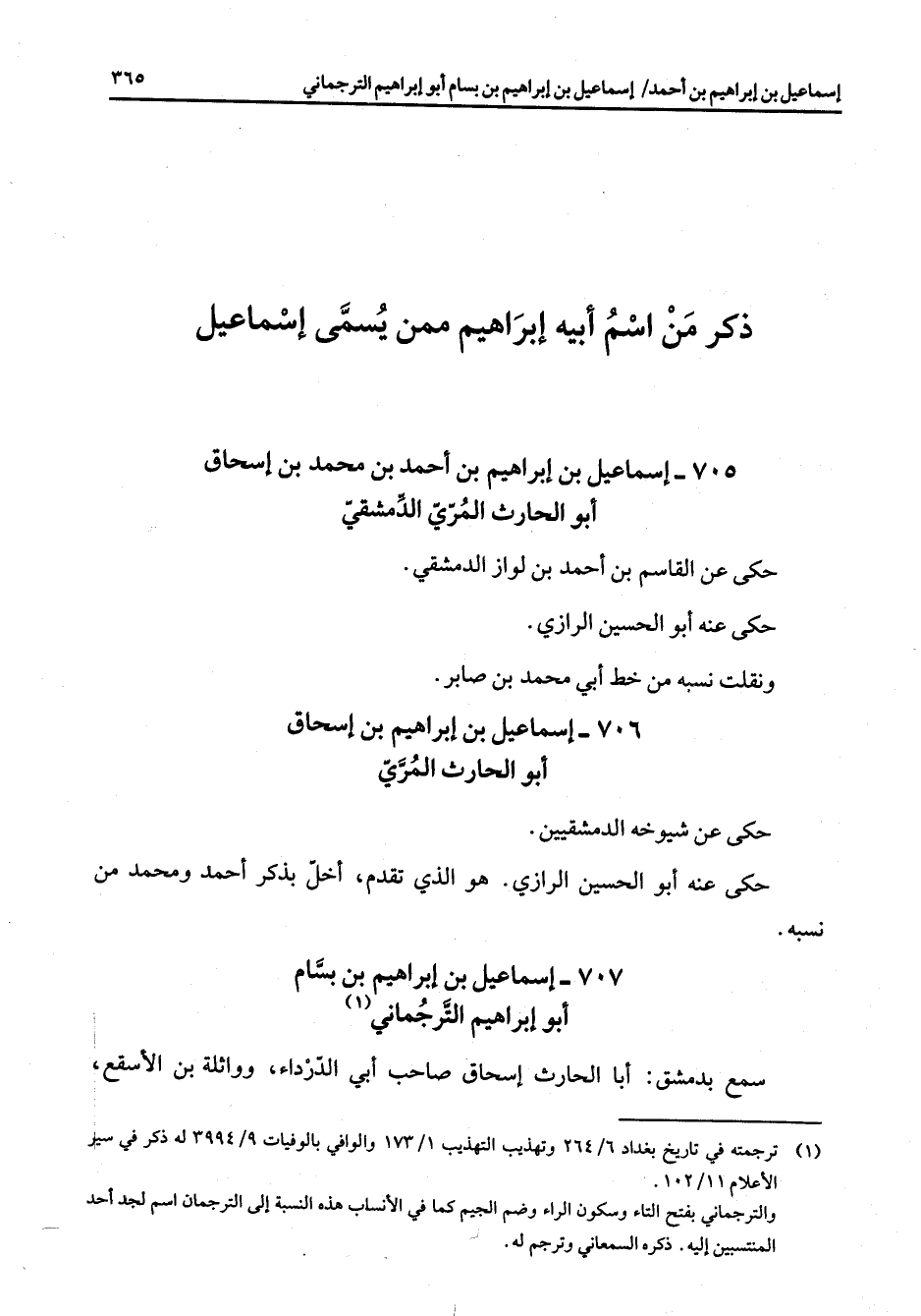 707 - إسماعيل بن إبراهيم بن بسام أبو إبراهيم الترجماني (1) سمع بدمشق أبا الحارث إسحاق صاحب أبي الدرداء وواثلة بن الأسقع