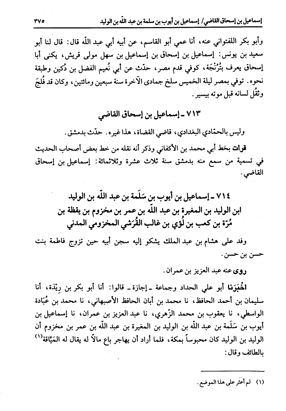 714 - إسماعيل بن أيوب بن سلمة بن عبد الله بن الوليد ابن الوليد بن المغيرة بن عبد الله بن عمر بن مخزوم بن يقظة بن مرة بن كعب بن لؤي بن غالب القرشي المخزومي المدني وفد على هشام بن عبد الملك يشكو إليه سجن أبيه حين تزوج فاطمة بنت حسن بن حسن روى عنه عبد العزيز بن عمران أخبرنا أبو علي الحداد وجماعة إجازة قالوا أنا أبو بكر بن ريذة أنا سليمان بن أحمد الحافظ نا محمد بن أبان الحافظ الأصبهاني نا محمد بن عبادة الواسطي نا يعقوب بن محمد الزهري نا عبد العزيز بن عمران نا إسماعيل بن أيوب بن سلمة بن عبد الله بن الوليد بن المغيرة بن عبد الله بن عمر بن مخزوم أن الوليد بن الوليد كان محبوسا بمكة فلما أراد أن يهاجر باع مالا له يقال له المياقة (1) بالطائف وقال: