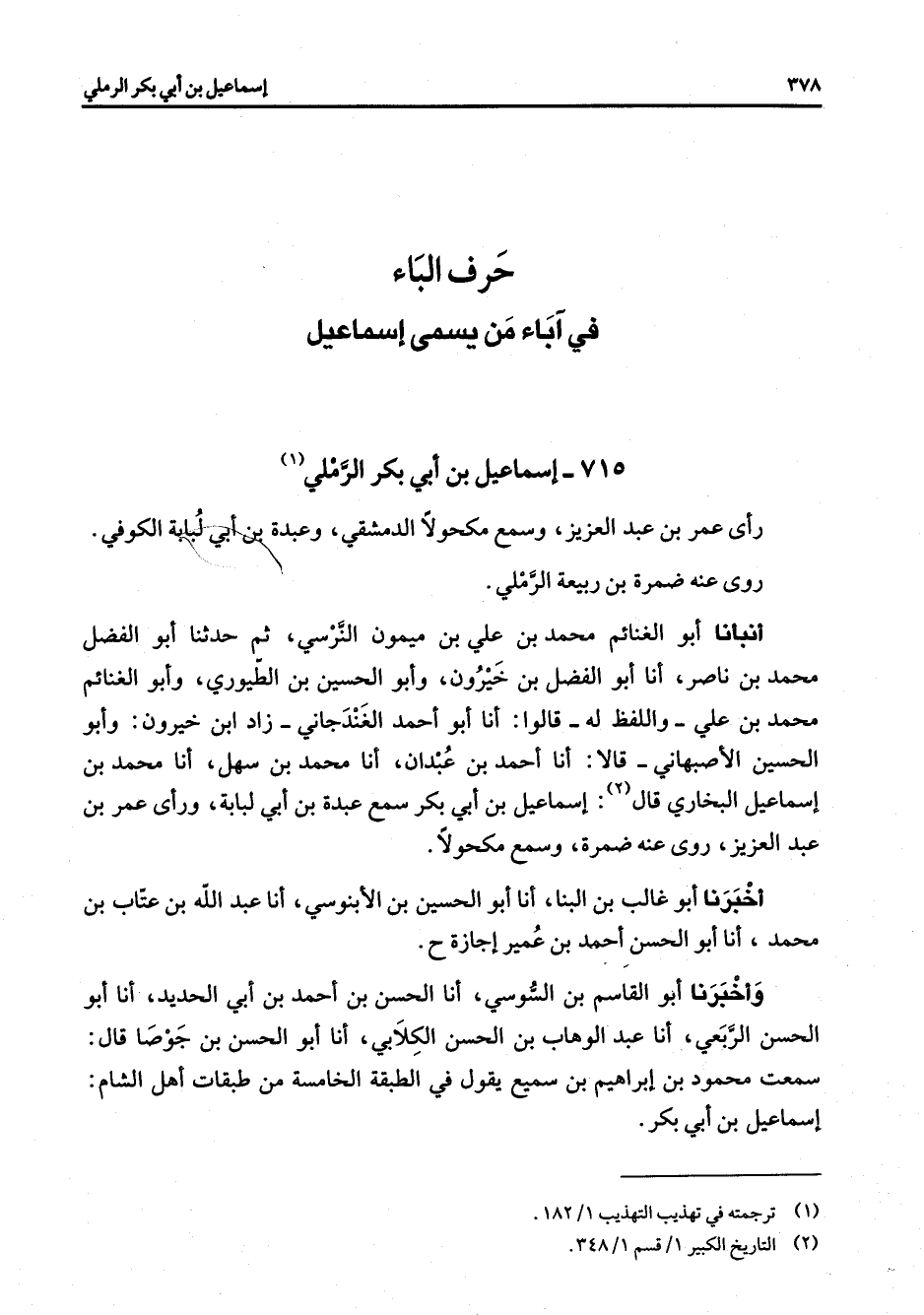 715 - إسماعيل بن أبي بكر الرملي رأى عمر بن عبد العزيز وسمع مكحولا الدمشقي وعبدة بن أبي لبابة الكوفي روى عنه ضمرة بن ربيعة الرملي أنبأنا أبو الغنائم محمد بن علي بن ميمون النرسي ثم حدثنا أبو الفضل محمد بن ناصر أنا أبو الفضل بن خيرون وأبو الحسين بن الطيوري وأبو الغنائم إ محمد بن علي واللفظ له قالوا أنا أبو أحمد الغندجاني زاد ابن خيرون وأبو الحسين الأصبهاني قالا أنا أحمد بن عبدان أنا محمد بن سهل أنا محمد بن إسماعيل البخاري قال (2) إسماعيل بن أبي بكر سمع عبدة بن أبي لبابة ورأى عمر بن عبد العزيز روى عنه ضمرة وسمع مكحولا أخبرنا أبو غالب بن البنا أنا أبو الحسين بن الأبنوسي أنا عبد الله بن عتاب بن محمد أنا أبو الحسن أحمد بن عمير إجازة وأخبرنا أبو القاسم بن السوسي أنا الحسن بن أحمد بن أبي الحديد أنا أبو الحسن الربعي أنا عبد الوهاب بن الحسن الكلابي أنا أبو الحسن بن جوصا قال سمعت محمود بن إبراهيم بن سميع يقول في الطبقة الخامسه من طبقات أهل الشام إسماعيل بن أبي بكر