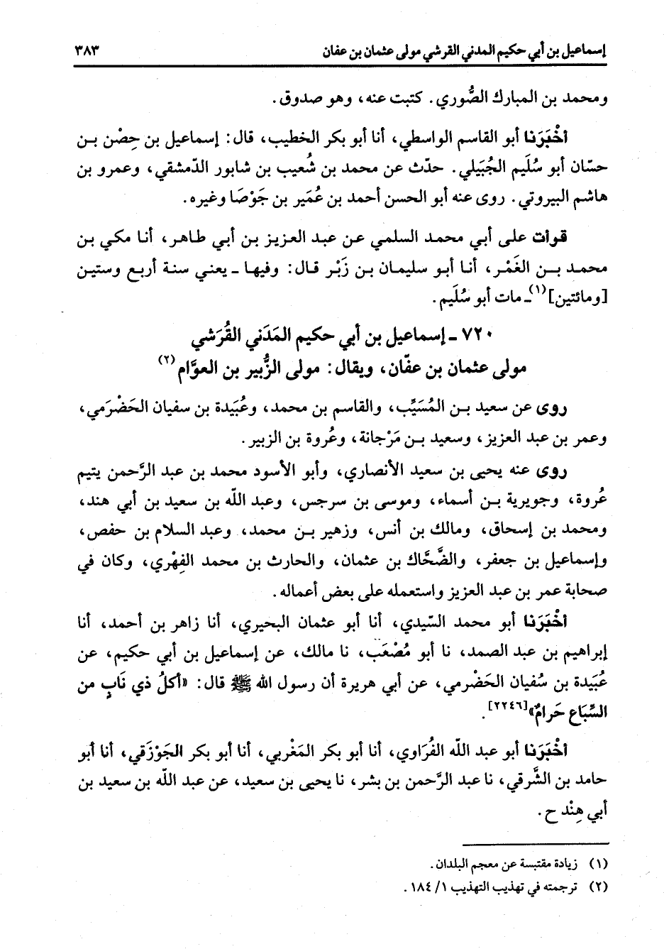 720 - إسماعيل بن أبي حكيم المدني القرشي مولى عثمان بن عفان ويقال مولى الزبير بن العوام (2) روى عن سعيد بن المسيب والقاسم بن محمد وعبيدة بن سفيان الحضرمي وعمر بن عبد العزيز وسعيد بن مرجانة وعروة بن الزبير روى عنه يحيى بن سعيد الأنصاري وأبو الأسود محمد بن عبد الرحمن يتيم عروة وجويرية بن أسماء وموسى بن سرجس وعبد الله بن سعيد بن أبي هند ومحمد بن إسحاق ومالك بن أنس وزهير بن محمد وعبد السلام بن حفص وإسماعيل بن جعفر والضحاك بن عثمان والحارث بن محمد الفهري وكان في صحابة عمر بن عبد العزيز واستعمله على بعض أعماله أخبرنا أبو محمد السيدي أنا أبو عثمان البحيري أنا زاهر بن أحمد أنا إبراهيم بن عبد الصمد نا أبو مصعب نا مالك عن إسماعيل بن أبي حكيم عن عبيدة بن سفيان الحضرمي عن أبي هريرة أن رسول الله (صلى الله عليه وسلم) قال أكل ذي ناب من السباع حرام أخبرنا أبو عبد الله الفراوي أنا أبو بكر المغربي أنا أبو بكر الجوزقي أنا أبو حامد بن الشرقي نا عبد الرحمن بن بشر نا يحيى بن سعيد عن عبد الله بن سعيد بن أبي هند ح