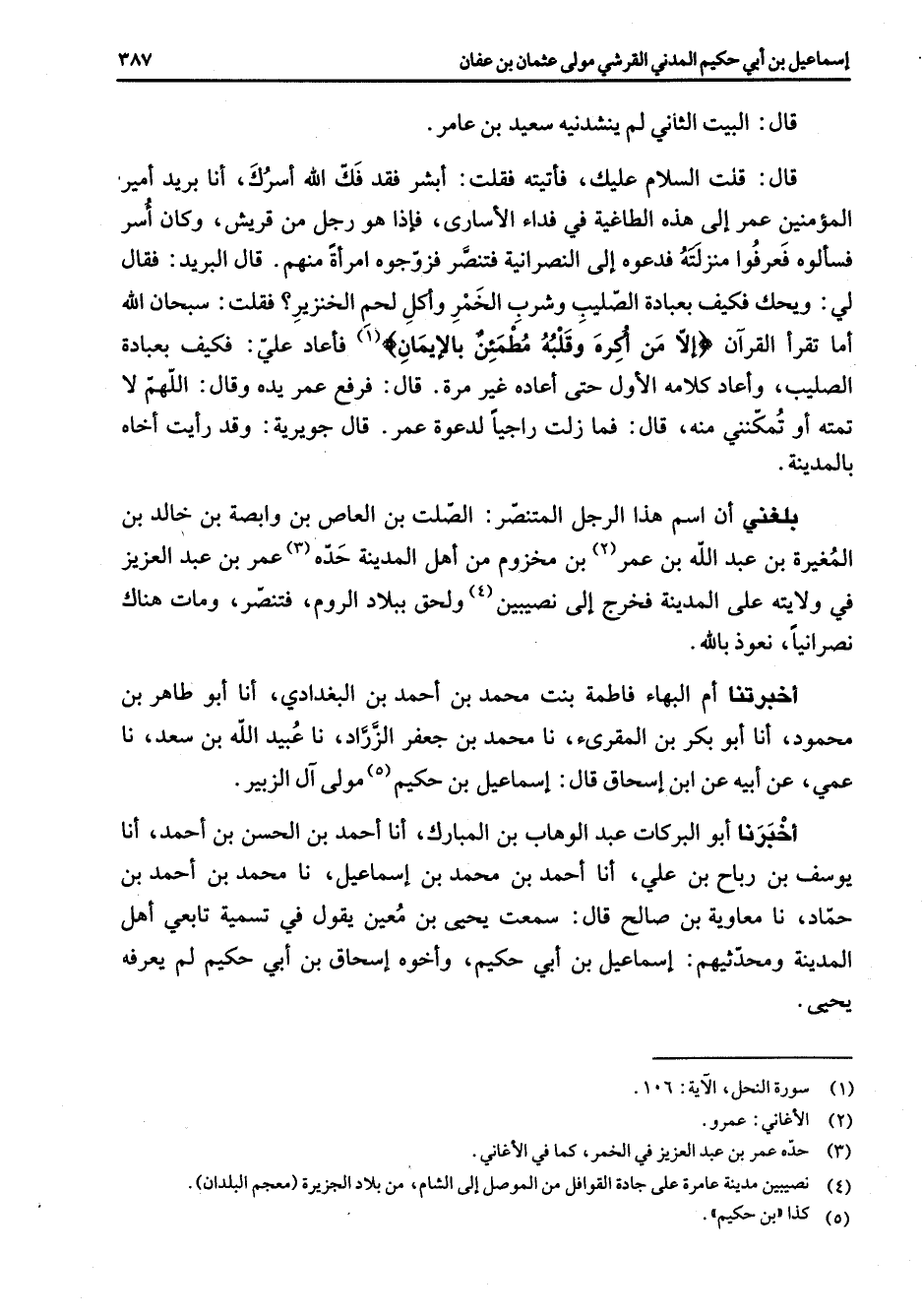 قال البيت الثاني لم ينشدنيه سعيد بن عامر قال قلت السلام عليك فأتيته فقلت أبشر فقد فك الله أسرك أنا بريد أمير المؤمنين عمر إلى هذه الطاغية في فداء الأساري فإذا هو رجل من قريش وكان أسر فسألوه فعرفوا منزلته فدعوه إلى النصرانية فتنصر فزوجوه امرأة منهم قال البريد فقال لي ويحك فكيف بعبادة الصليب وشرب الخمر وأكل لحم الخنزير فقلت سبحان الله أما تقرأ القرآن " إلا من أكره وقبله مطمئن بالإيمان (1) " فأعاد علي فكيف بعبادة الصليب وأعاد كلامه الأول حتى أعاده غير مرة قال فرفع عمر يده وقال اللهم لا تمته أو تمكنني منه قال فما زلت راجيا لدعوة عمر قال جويرية وقد رأيت أخاه بالمدينة بلغني أن اسم هذا الرجل المتنصر الصلت بن العاص بن وابصة بن خالد بن المغيرة بن عبد الله بن عمر (2) بن مخزوم من أهل المدينة حده (3) عمر بن عبد العزيز في ولايته على المدينة فخرج إلى نصيبين (4) ولحق ببلاد الروم فتنصر ومات هناك نصرانيا نعوذ بالله أخبرتنا أم البهاء فاطمة بنت محمد بن أحمد بن البغدادي أنا أبو طاهر بن محمود أنا أبو بكر بن المقرئ نا محمد بن جعفر الزراد نا عبيد الله بن سعد نا عمي عن أبيه عن ابن إسحاق قال إسماعيل بن حكيم (5) مولى آل الزبير أخبرنا أبو البركات عبد الوهاب بن المبارك أنا أحمد بن الحسن بن أحمد أنا يوسف بن رباح بن علي أنا أحمد بن محمد بن إسماعيل نا محمد بن أحمد بن حماد نا معاوية بن صالح قال سمعت يحيى بن معين يقول في تسمية تابعي أهل المدينة ومحدثيهم إسماعيل بن أبي حكيم وأخوه إسحاق بن أبي حكيم لم يعرفه يحيى
