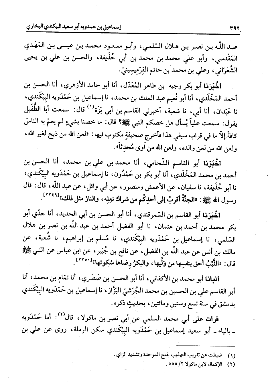 عبد الله بن نصر بن هلال السلمي وأبو مسعود محمد بن عيسى بن المهدي المقدسي وأبو علي محمد بن محمد بن أبي حذيفة والحسن بن علي بن يحيى الشعراني وعلي بن محمد بن حاتم القرميسيني أخبرنا أبو بكر وجيه بن طاهر المعدل أنا أبو حامد الأزهري أنا الحسن بن أحمد المخلدي أنا أبو نعيم عبد الملك بن محمد نا إسماعيل بن حمدوية البيكندي نا عبدان أنا أبي نا شعبة أخبرني القاسم بن أبي بزة قال سمعت أبا الطفيل يقول سمعت عليا يسأل هل خصكم النبي (صلى الله عليه وسلم) قال ما خصنا بشئ لم يعم به الناس كافة إلا ما في قراب سيفي هذا فأخرج صحيفة مكتوب فيها لعن الله من ذبح لغير الله ولعن الله من لعن والده ولعن الله من آوى محدثا أخبرنا أبو القاسم الشحامي أنا محمد بن علي بن محمد أنا الحسن بن أحمد بن محمد المخلدي أنا أبو بكر بن حمدون نا إسماعيل بن حمدوية البيكندي نا أبو حذيفة نا سفيان عن الأعمش ومنصور عن أبي وائل عن عبد الله قال قال رسول الله (صلى الله عليه وسلم) الجنة أقرب إلى أحدكم من شراك نعله والنار مثل ذلك [* * * * أخبرنا أبو القاسم بن السمرقندي أنا أبو الحسن بن أبي الحديد أنا جدي أبو بكر محمد بن أحمد بن عثمان نا أبو الفضل أحمد بن عبد الله بن نصر بن هلال السلمي نا إسماعيل بن حمدوية البيكندي نا مسلم بن إبراهيم نا شعبة عن مالك بن أنس عن عبد الله بن الفضل عن نافع بن جبير عن ابن عباس عن النبي (صلى الله عليه وسلم) قال الثيب أحق بنفسها من وليها والبكر رضاها سكوتها أنبأنا أبو محمد بن الأكفاني أنا أبو الحسن بن صصري أنا تمام بن محمد أنا أبو القاسم علي بن الحسين بن محمد الجرشي البزاز نا إسماعيل بن حمدوية البيكندي بدمشق في سنة تسع وستين ومائتين بحديث ذكره قرأت على أبي محمد السلمي عن أبي نصر بن ماكولا قال أما حمدوية بالياء أبو سعيد إسماعيل بن حمدوية البيكندي سكن الرملة روى عن علي بن
