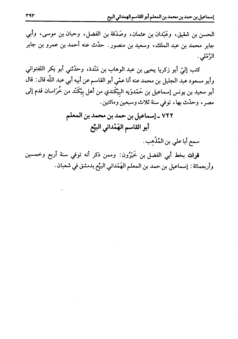722 - إسماعيل بن حمد بن محمد بن المعلم أبو القاسم الهمداني البيع سمع أبا علي بن المذهب قرأت بخط أبي الفضل بن خيرون وممن ذكر أنه توفي سنة أربع وخمسين وأربعمائة إسماعيل بن حمد بن المعلم الهمداني البيع بدمشق في شعبان