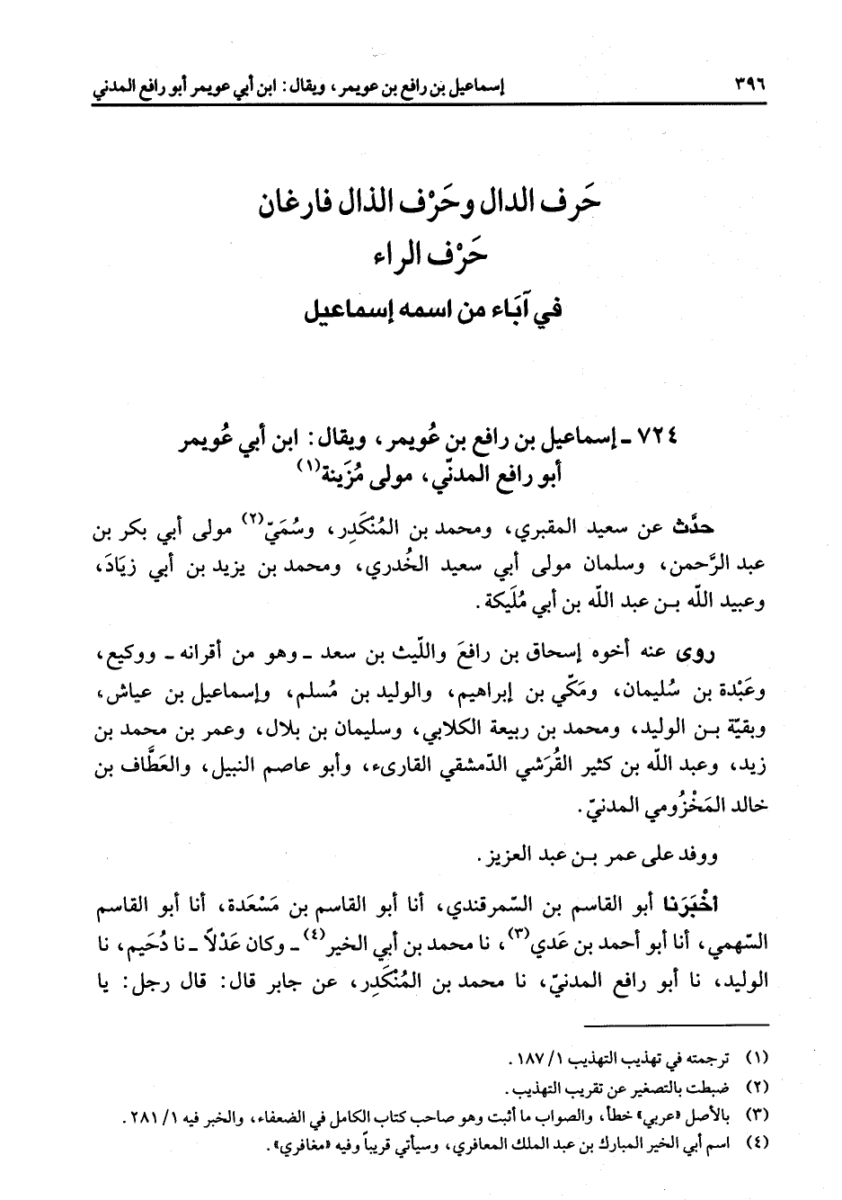 724 - إسماعيل بن رافع بن عويمر ويقال ابن أبي عويمر أبو رافع المدني مولى مزينة (1) حدث عن سعيد المقبري ومحمد بن المنكدر وسمي (2) مولى أبي بكر بن عبد الرحمن وسلمان مولى أبي سعيد الخدري ومحمد بن يزيد بن أبي زياد وعبيد الله بن عبد الله بن أبي مليكة روى عنه أخوه إسحاق بن رافع والليث بن سعد وهو من أقرانه ووكيع وعبدة بن سليمان ومكي بن إبراهيم والوليد بن مسلم وإسماعيل بن عياش وبقية بن الوليد ومحمد بن ربيعة الكلابي وسليمان بن بلال وعمر بن محمد بن زيد وعبد الله بن كثير القرشي الدمشقي القارئ وأبو عاصم النبيل والعطاف بن خالد المخزومي المدني ووفد على عمر بن عبد العزيز أخبرنا أبو القاسم بن السمرقندي أنا أبو القاسم بن مسعدة أنا أبو القاسم السهمي أنا أبو أحمد بن عدي (3) نا محمد بن أبي الخير (4) وكان عدلا نا دحيم نا الوليد نا أبو رافع المدني نا محمد بن المنكدر عن جابر قال قال رجل يا