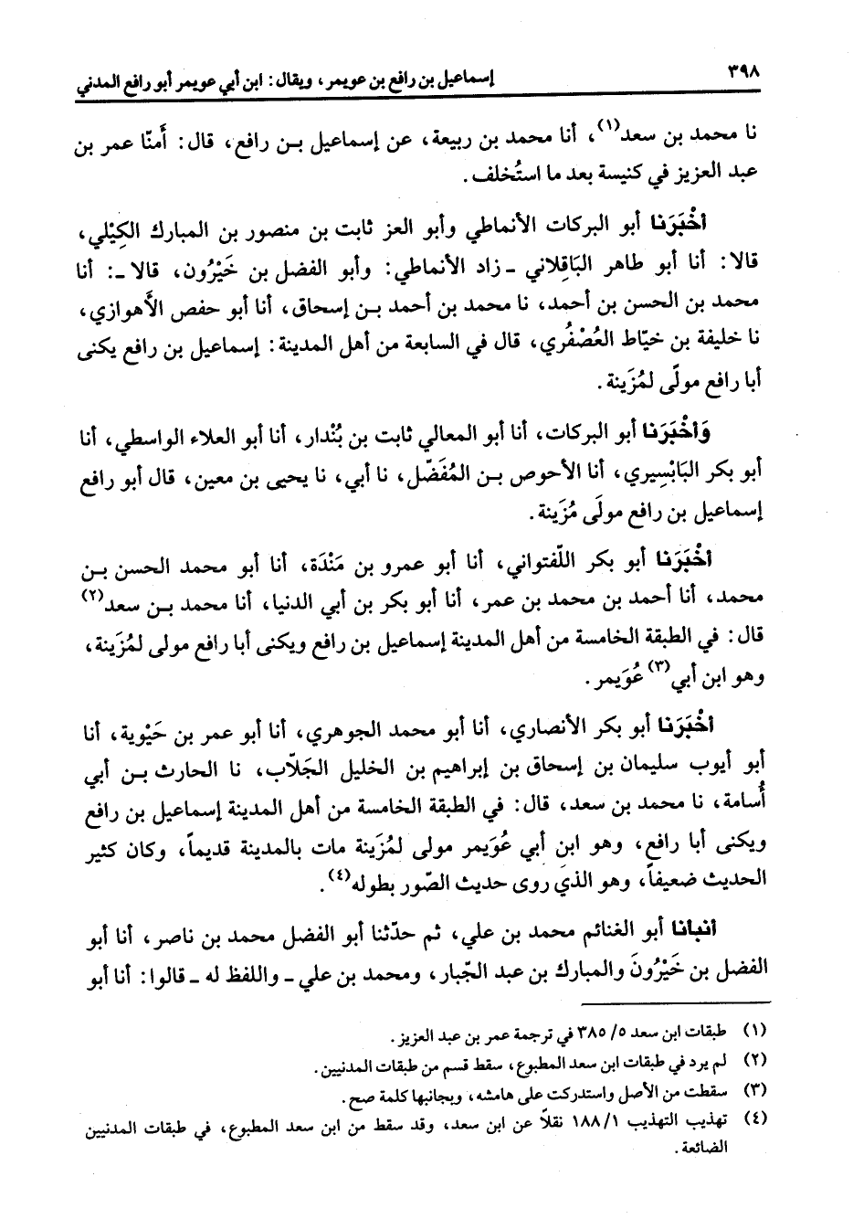 نا محمد بن سعد (1) أنا محمد بن ربيعه عن اسماعيل بن رافع قال امنا عمر بن عبد العزيز في كنيسه بعد ما استخلف أخبرنا أبو البركات الأنماطي وأبو العز ثابت بن بن منصور بن المبارك الكيلي قالا أنا أبو طاهر الباقلاني زاد الأنماطي وأبو الفضل بن خيرون قالا أنا محمد بن الحسبن أحمد نا محمد بن أحمد بن إسحاق أنا أبو حفص الأهوازي نا خليفة بن خياط العصفري قال في السابعة من أهل المدينة إسماعيل بن رافع يكنى أبا رافع مولى لمزينة وأخبرنا أبو البركات أنا أبو المعالي ثابت بن بندار أنا أبو العلاء الواسطي أنا أبو بكر البابسيري أنا الأحوص بن المفضل نا أبي نا يحيى بن معين قال أبو رافع إسماعيل بن رافع مولى مزينة أخبرنا أبو بكر اللفتواني أنا أبو عمرو بن مندة أنا أبو محمد الحسن بن محمد أنا أحمد بن محمد بن عمر أنا أبو بكر بن أبي الدنيا أنا محمد بن سعد (2) قال في الطبقة الخامسة من أهل المدينة إسماعيل بن رافع ويكنى أبا رافع مولى لمزينة وهو ابن أبي (3) عويمر أخبرنا أبو بكر الأنصاري أنا أبو محمد الجوهري أنا أبو عمر بن حيوية أنا أبو أيوب سليمان بن إسحاق بن إبراهيم بن الخليل الجلاب نا الحارث بن أبي أسامة نا محمد بن سعد قال في الطبقة الخامسة من أهل المدينة إسماعيل بن رافع ويكنى أبا رافع وهو ابن أبي عويمر مولى لمزينة مات بالمدينة قديما وكان كثير الحديث ضعيفا وهو الذي روى حديث الصور بطوله (4) أنبأنا أبو الغنائم محمد بن علي ثم حدثنا أبو الفضل محمد بن ناصر أنا أبو الفضل بن خيرون والمبارك بن عبد الجبار ومحمد بن علي واللفظ له قالوا أنا أبو