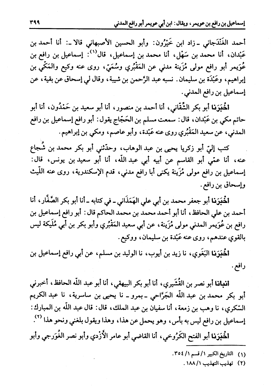 أحمد الغندجاني زاد ابن خيرون وأبو الحسين الأصبهاني قالا أنا أحمد بن عبدان أنا محمد بن سهل أنا محمد بن إسماعيل قال (1) إسماعيل بن رافع بن عويمر أبو رافع مولى مزينة مدني عن المقبري وسمي روى عنه وكيع والمكي بن إبراهيم وعبدة بن سليمان نسبه عبد الرحمن بن شيبة وقال لي إسحاق عن بقية عن إسماعيل بن رافع المدني أخبرنا أبو بكر الشقاني أنا أحمد بن منصور أنا أبو سعيد بن حمدون أنا أبو حاتم مكي بن عبدان قال سمعت مسلم بن الحجاج يقول أبو رافع إسماعيل بن رافع المدني عن سعيد المقبري روى عنه عبدة وأبو عاصم ومكي بن إبراهيم كتب إلي أبو زكريا يحيى بن عبد الوهاب وحدثني أبو بكر محمد بن شجاع عنه أنا عمي أبو القاسم عن أبيه أبي عبد الله أنا أبو سعيد بن يونس قال إسماعيل بن رافع مولى مزينة يكنى أبا رافع مدني قدم الإسكندرية روى عنه الليث وإسحاق بن رافع أخبرنا أبو جعفر محمد بن أبي علي الهمذاني في كتابه أنا أبو بكر الصفار أنا أحمد بن علي الحافظ أنا أبو أحمد محمد بن محمد الحاكم قال أبو رافع إسماعيل بن رافع بن عويمر المدني مولى مزينة عن أبي سعيد المقبري وأبو بكر بن أبي مليكة ليس بالقوي عندهم روى عنه عبدة بن سليمان ووكيع أخبرنا البغوي نا زيد بن أيوب نا الوليد بن مسلم عن أبي رافع إسماعيل بن رافع أنبأنا أبو نصر بن القشيري أنا أبو بكر البيهقي أنا أبو عبد الله الحافظ أخبرني أبو بكر محمد بن عبد الله الجراحي بمرو نا يحيى بن ساسرية نا عبد الكريم السكري نا وهب بن زمعة أنا سفيان بن عبد الملك قال قال عبد الله بن المبارك إسماعيل بن رافع ليس به بأس وهو يحمل عن هذا وهذا ويقول بلغني ونحو هذا (2) أخبرنا أبو الفتح الكروخي أنا القاضي أبو عامر الأزدي وأبو نصر الغورجي وأبو