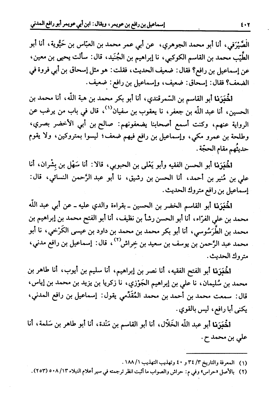 الصيرفي أنا أبو محمد الجوهري عن أبي عمر محمد بن العباس بن حيوية أنا أبو الطيب محمد بن القاسم الكوكبي نا إبراهيم بن الجنيد قال سألت يحيى بن معين عن إسماعيل بن رافع فقال ضعيف الحديث فقلت هو مثل إسحاق بن أبي فروة في الضعف فقال إسحاق ضعيف وإسماعيل بن رافع ضعيف أخبرنا أبو القاسم بن السمرقندي أنا أبو بكر محمد بن هبة الله أنا محمد بن الحسين أنا عبد الله بن جعفر نا يعقوب بن سفيان (1) قال في باب من يرغب عن الرواية عنهم وكنت أسمع أصحابنا يضعفونهم صالح بن أبي الأخضر بصري وطلحة بن عمرو مكي وإسماعيل بن رافع فيهم ضعف ليسوا بمتروكين ولا يقوم حديثهم مقام الحجة أخبرنا أبو الحسن الفقيه وأبو يعلى بن الحبوبي قالا أنا سهل بن بشران أنا علي بن منير بن أحمد أنا الحسن بن رشيق نا أبو عبد الرحمن النسائي قال إسماعيل بن رافع متروك الحديث أخبرنا أبو القاسم الخضر بن الحسين بقراءة والدي عليه عن أبي عبد الله محمد بن علي الفراء أنا أبو الحسن رشأ بن نظيف أنا أبو الفتح محمد بن إبراهيم بن محمد بن الطرسوسي أنا أبو بكر محمد بن محمد بن داود بن عيسى الكرخي نا أبو محمد عبد الرحمن بن يوسف بن سعيد بن خراش قال إسماعيل بن رافع مدني متروك الحديث أخبرنا أبو الفتح الفقيه أنا نصر بن إبراهيم أنا سليم بن أيوب أنا طاهر بن محمد بن سليمان نا علي بن إبراهيم الجوزي نا زكريا بن يزيد بن محمد بن إياس قال سمعت محمد بن أحمد بن محمد المقدمي يقول إسماعيل بن رافع المدني يكنى أبا رافع ليس بالقوي أخبرنا أبو عبد الله الخلال أنا أبو القاسم بن مندة أنا أبو طاهر بن سلمة أنا علي بن محمد ح
