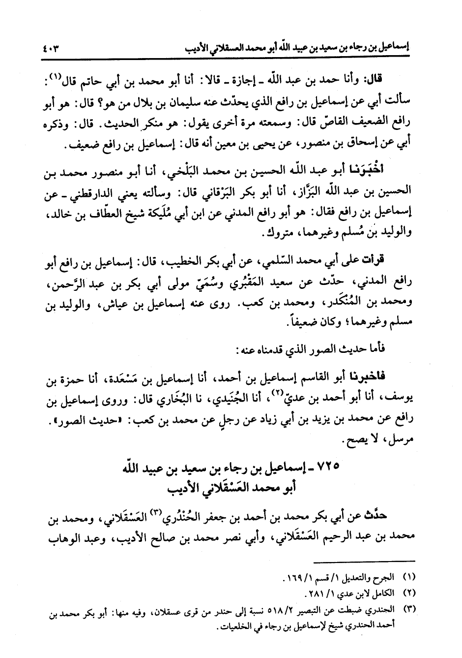 (3) الحندري ضبطت عن التبصير 2 / 518 نسبة إلى حندر من قرى عسقلان وفيه منها: أبو بكر محمد بن أحمد الحندري شيخ لاسماعيل بن رجاء في الخلعيات