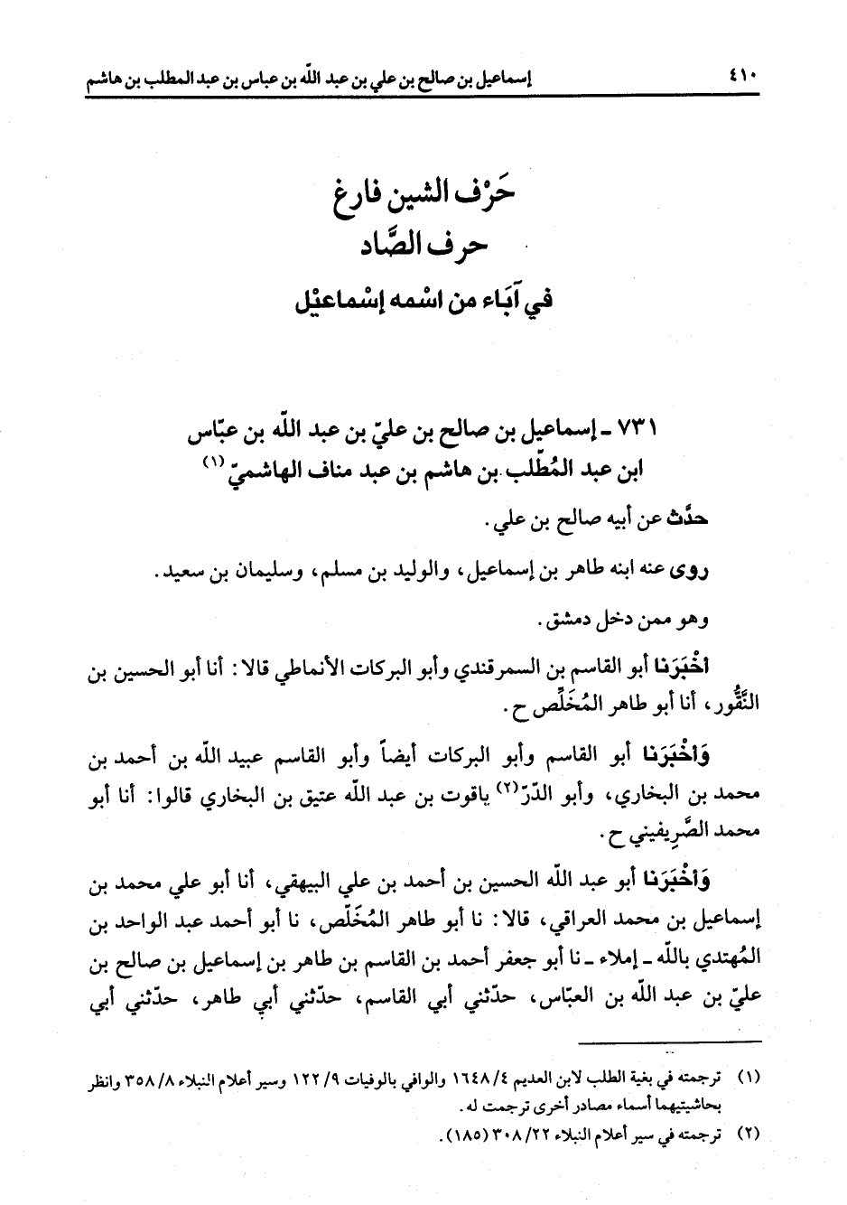 " حرف الشين فارغ " " حرف الصاد في آباء من اسمه إسماعيل " 731 إسماعيل بن صالح بن علي بن عبد الله عباس ابن عبد المطلب بن هاشم بن عبد مناف الهاشمي (1) حدث عن أبيه صالح بن علي روى عنه ابنه طاهر بن إسماعيل والوليد بن مسلم وسليمان بن سعيد وهو ممن دخل دمشق أخبرنا أبو القاسم بن السمرقندي وأبو البركات الأنماطي قالا أنا أبو الحسين بن النقور أنا أبو طاهر المخلص وأخبرنا أبو القاسم وأبو البركات أيضا وأبو القاسم عبيد الله بن أحمد بن محمد بن البخاري وأبو الدر (2) ياقوت بن عبد الله عتيق بن البخاري قالوا أنا أبو محمد الصريفيني وأخبرنا أبو عبد الله الحسين بن أحمد بن علي البيهقي أنا أبو علي محمد بن إسماعيل بن محمد العراقي قالا نا أبو طاهر المخلص نا أبو أحمد عبد الواحد المهتدي بالله إملاء نا أبو جعفر أحمد بن القاسم بن طاهر بن إسماعيل بن صالح بن علي بن عبد الله بن العباس حدثني أبي القاسم حدثني أبي طاهر حدثني أبي