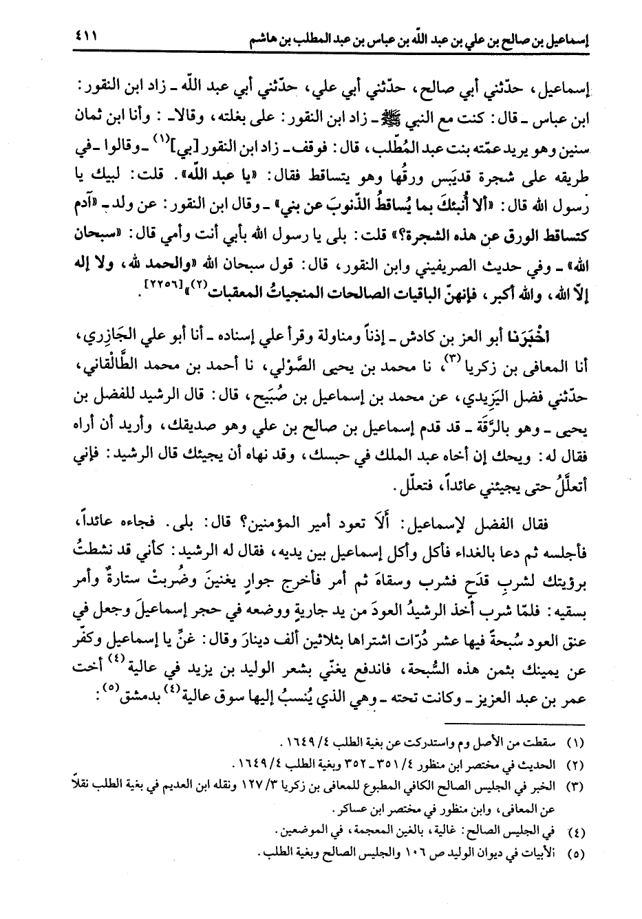 (3) الخبر في الجليس الصالح الكافي المطبوع للمعافي بن زكريا 3 / 127 ونقله ابن العديم في بغية الطلب نقلا عن المعافي وابن منظور في مختصر ابن عساكر