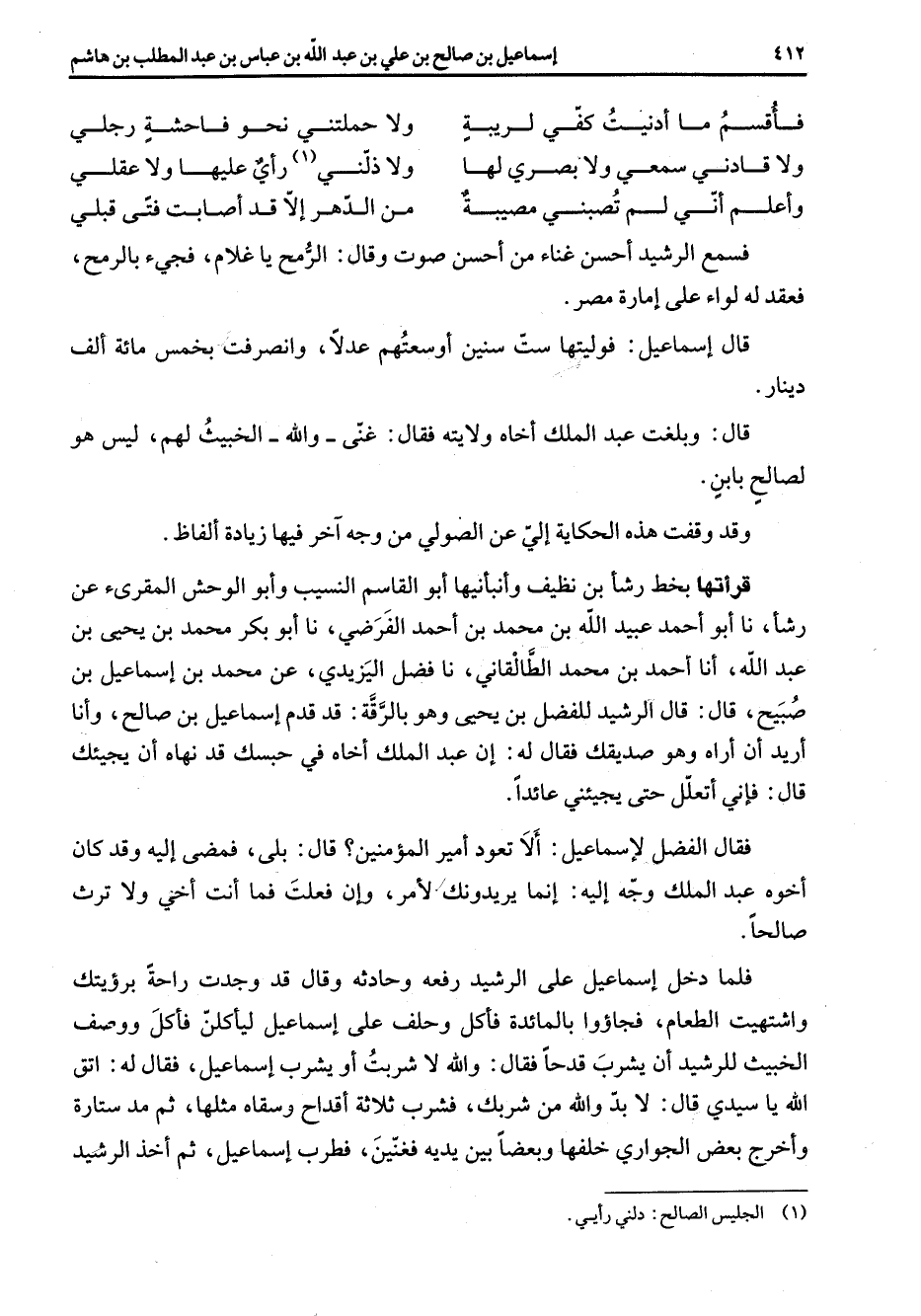 * فأقما أدنيت كفي لريبة * ولا حملتني نحو فاحشة رجلي ولا قادني سمعي ولا بصري لها ولا ذلني رأي عليها ولا عقلي واعلم أني لم تصبني مصيبة * من الدهر إلا قد أصابت فتى قبلي * فسمع الرشيد أحسن غناء من أحسن صوت وقال الرمح يا غلام فجئ بالرمح فعقد له لواء على إمارة مصر قال إسماعيل فوليتها ست سنين أوسعتهم عدلا وانصرفت بخمس مائة ألف دينار قال وبلغت عبد الملك أخاه ولايته فقال غنى والله الخبيث لهم ليس هو لصالح بابن وقد وقفت هذه الحكاية إلي عن الصولي من وجه آخر فيها زيادة ألفاظ قرأتها بخط رشأ بن نظيف وأنبأنيها أبو القاسم النسيب وأبو الوحش المقرئ عن رشأ نا أبو أحمد عبيد الله بن محمد بن أحمد الفرضي نا أبو بكر محمد بن يحيى بن عبد الله أنا أحمد بن محمد الطالقاني نا فضل اليزيدي عن محمد بن إسماعيل بن صبيح قال قال الرشيد للفضل بن يحيى وهو بالرقة قد قدم إسماعيل بن صالح وأنا أريد أن أراه وهو صديقك فقال له إن عبد الملك أخاه في حبسك قد نهاه أن يجيئك قال فإني أتعلل حتى يجيئني عائدا فقال الفضل لإسماعيل ألا تعود أمير المؤمنين قال بلى فمضى إليه وقد كان أخوه عبد الملك وجه إليه إنما يريدونك لأمر وإن فعلت فما أنت أخي ولا ترث صالحا فلما دخل إسماعيل على الرشيد رفعه وحادثه وقال قد وجدت رائحة برؤيتك واشتهيت الطعام فجاؤوا بالمائدة فأكل وحلف على إسماعيل ليأكلن فأكل ووصف الخبيث للرشيد أن يشرب قدح فقال والله لا شربت أو يشرب إسماعيل فقال له اتق الله يا سيدي قال لابد والله من شربك فشرب ثلاثة أقداح وسقاه مثلها ثم مد ستارة وأخرج بعض الجواري خلفها وبعضا بين يديه فغنين فطرب إسماعيل ثم أخذ الرشيد