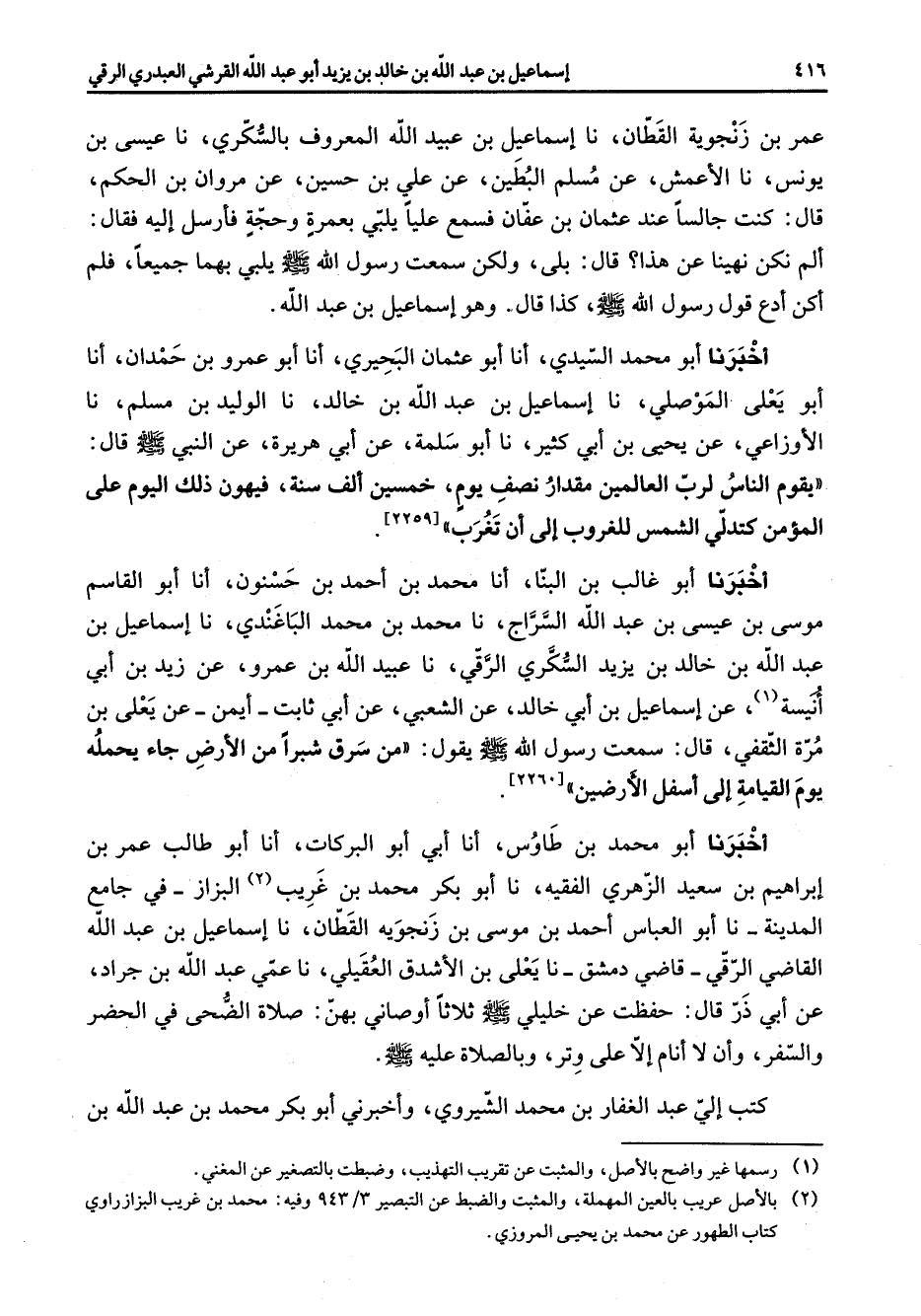 عمر بن زنجوية القطان نا إسماعيل بن عبيد الله المعروف بالسكري نا عيسى بن يونس نا الأعمش عن مسلم البطين عن علي بن حسين عن مروان بن الحكم قال كنت جالسا عند عثمان بن عفان فسمع علينا يلبي بعمرة وحجة فأرسل إليه فقال ألم نكن نهينا عن هذا قال بلى ولكن سمعت رسول الله (صلى الله عليه وسلم) يلبي بهما جميعا فلم أكن ادع قول رسول الله (صلى الله عليه وسلم) كذا قال وهو إسماعيل بن عبد الله أخبرنا أبو محمد السيدي أنا أبو عثمان البحيري أنا أبو عمرو بن حمدان أنا أبو يعلى المصلي نا إسماعيل بن عبد الله بن خالد نا الوليد بن مسلم نا الأوزاعي عن يحيى بن أبي كثير نا أبو سلمة عن أبي هريرة عن النبي (صلى الله عليه وسلم) قال يقوم الناس لرب العالمين مقدار نصف يوم خمسين ألف سنة فيهون ذلك اليوم على المؤمن كتدلي الشمس للغروب إلى أن تغرب أخبرنا أبو غالب بن البنا أنا محمد بن أحمد بن حسنون أنا أبو القاسم موسى بن عيسى بن عبد الله السراج نا محمد بن محمد الباغندي نا إسماعيل بن عبد الله بن خالد بن يزيد السكري الرقي نا عبيد الله بن عمرو عن زيد بن أبي أنيسة (1) عن إسماعيل بن أبي خالد عن الشعبي عن أبي ثابت أيمن عن يعلى بن مرة الثقفي قال سمعت رسول الله (صلى الله عليه وسلم) يقول من سرق شبرا من الأرض جاء يحمله يوم القيامة إلى أسفل الأرضين أخبرنا أبو محمد بن طاوس أنا أبي أبو البركات أنا أبو طالب عمر بن إبراهيم بن سعيد الزهري الفقيه نا أبو بكر محمد بن غريب (2) البزاز في جامع المدينة نا أبو العباس أحمد بن موسى بن زنجويه القطان نا إسماعيل بن عبد الله القاضي الرقي قاضي دمشق نا يعلى بن الأشدق العقيلي نا عمي عبد الله بن جراد عن أبي ذر قال حفظت عن خليلي (صلى الله عليه وسلم) ثلاثا أوصاني بهن صلاة الضحى في الحضر والسفر وأن لا أنام إلا على وتر وبالصلاة عليه (صلى الله عليه وسلم) كتب إلي عبد الغفار بن محمد الشيروي وأخبرني أبو بكر محمد بن عبد الله بن