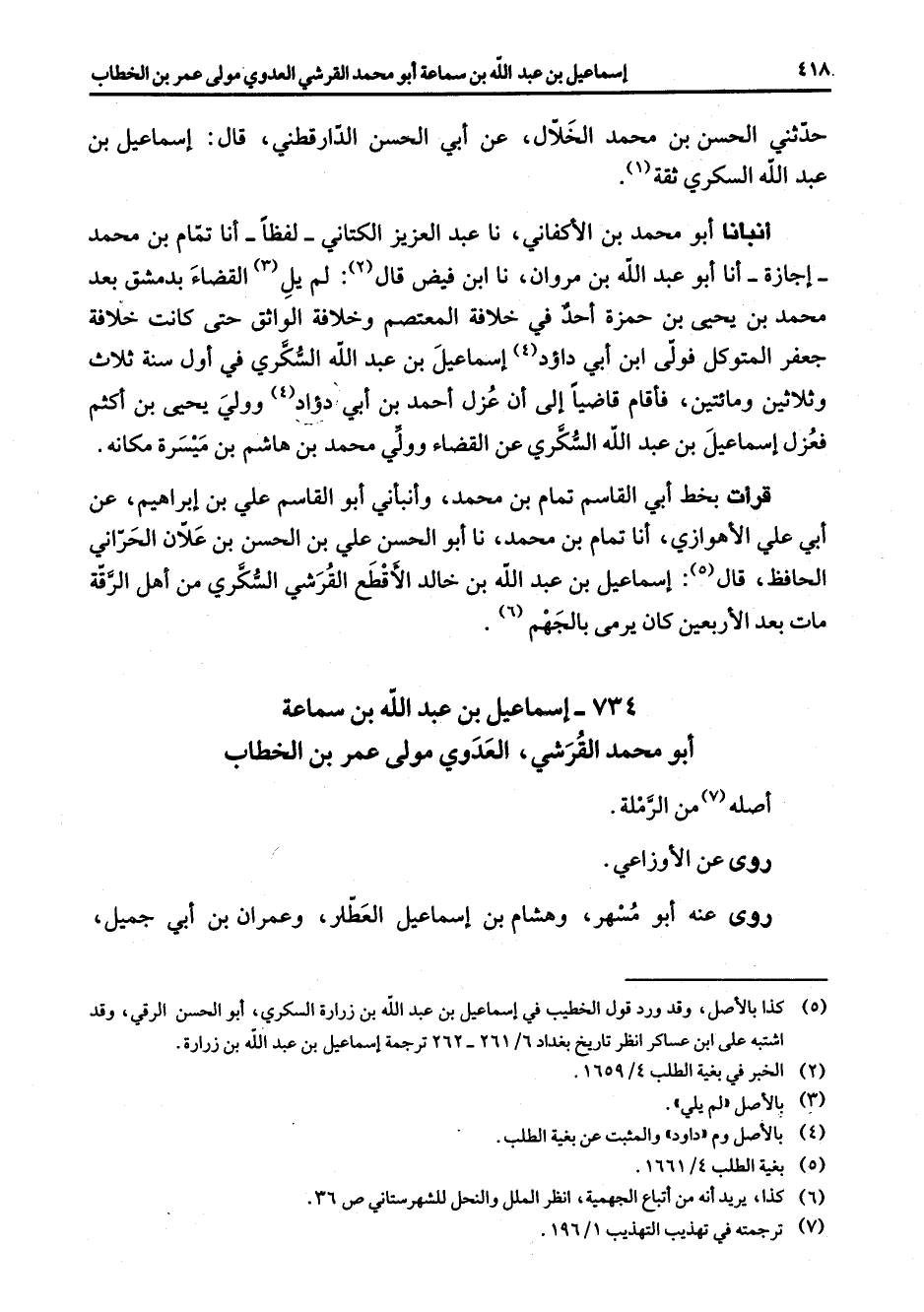 734 - إسماعيل بن عبد الله بن سماعة أبو محمد القرشي العدوي مولى عمر بن الخطاب أصله (9 7 من الرملة روى عن الأوزاعي روى عنه أبو مسهر وهشام بن إسماعيل العطار وعمران بن أبي جميل