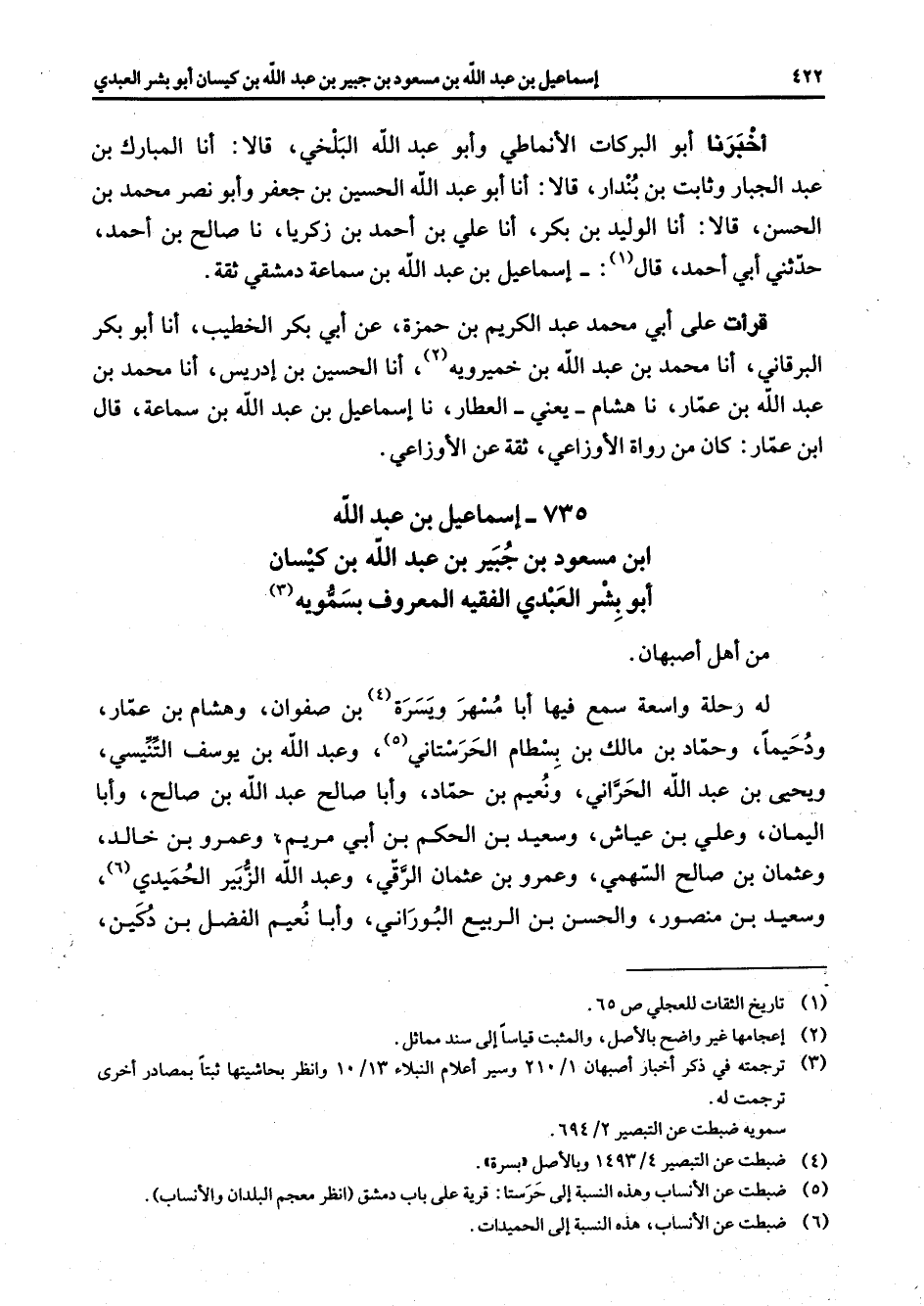 735 - إسماعيل بن عبد الله ابن مسعود بن جبير بن عبد الله بن كيسان أبو بشر العبدي الفقيه المعروف بسمويه (3) من أهل أصبهان له رحلة واسعة سمع فيها أبا مسهر ويسرة (4) بن صفوان وهشام بن عمار ودحيما وحماد بن مالك بن بسطام الحرستاني (5) وعبد الله بن يوسف التنيسي ويحيى بن عبد الله الحراني ونعيم بن حماد وأبا صالح عبد الله بن صالح وأبا اليمان علي بن عياش وسعيد بن الحكم بن أبي مريم وعمرو بن خالد وعثمان بن صالح السهمي وعمرو بن عثمان الرقي وعبد الله الزبير الحميدي وسعيد بن منصور والحسن بن الربيع البوراني وأبا نعيم الفضل بن دكين