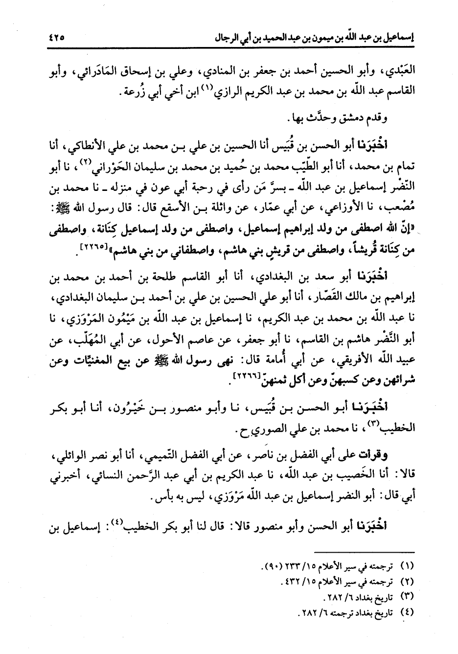 العبدي وأبو الحسين أحمد بن جعفر بن المنادي وعلي بن إسحاق المادرائي وأبو القاسم عبد الله بن محمد بن عبد الكريم الرازي ابن أخي أبي زرعة وقدم دمشق وحدث بها أخبرنا أبو الحسن بن قبيس أنا الحسين بن علي بن محمد بن علي الأنطاكي أنا تمام بن محمد أنا أبو الطيب محمد بن حميد بن محمد بن سليمان الحوراني (2) نا أبو النضر إسماعيل بن عبد الله بسر من رأى رحبة أبي عون في منزله نا محمد بن مصعب نا الأوزاعي عن أبي عمار عن واثلة بن الأسقع قال قال رسول الله (صلى الله عليه وسلم) إن الله اصطفى من ولد إبراهيم إسماعيل واصطفى من ولد إسماعيل كنانة واصطفى من كنانة قريش واصطفى من قريش بني هاشم واصطفاني من بني هاشم أخبرنا أبو سعد بن البغدادي أنا أبو القاسم طلحة بن أحمد بن محمد بن إبراهيم بن مالك القصار أنا أبو علي الحسين بن علي بن أحمد بن سليمان البغدادي نا عبد الله بن محمد بن عبد الكريم نا إسماعيل بن عبد الله بن ميمون المروزي نا أبو النضر هاشم بن القاسم نا أبو جعفر عن عاصم الأحول عن أبي المهلب عن عبيد الله الأفريقي عن أبي أمامة قال نهى رسول الله (صلى الله عليه وسلم) عن بيع المغنيات وعن شرائهن وعن كسبهن وعن أكل ثمنهن أخبرنا أبو الحسن بن قبيس نا وأبو منصور بن خيرون أنا أبو بكر الخطيب (3) نا محمد بن علي الصوري وقرأت على أبي الفضل بن ناصر عن أبي الفضل التميمي أنا أبو نصر الوائلي قالا أنا الخصيب بن عبد الله نا عبد الكريم بن أبي عبد الرحمن النسائي أخبرني أبي قال أبو النضر إسماعيل بن عبد الله مروزي ليس به بأس أخبرنا أبو الحسن وأبو منصور قالا قال لنا أبو بكر الخطيب (4) إسماعيل بن