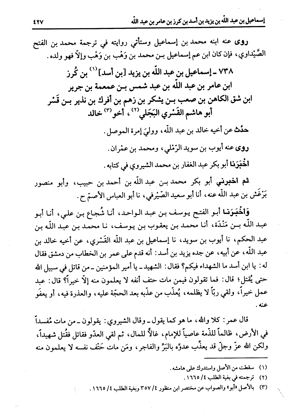 738 - إسماعيل بن عبد الله بن يزيد بن أسد (1) بن كرز ابن عامر بن عبد الله بن عبد شمس بن عمعمة بن جرير ابن شق الكاهن بن صعب بن يشكر بن زهم بن أفرك بن نذير بن قسر أبو هاشم القسري البجلي (2) أخو (3) خالد حدث عن أخيه خالد بن عبد الله وولى إمرة الموصل روى عنه أيوب بن سويد الرملي ومحمد بن عمران أخبرنا أبو بكر عبد الغفار بن محمد الشيروي في كتابه ثم أخبرني أبو بكر محمد بن عبد الله بن أحمد بن حبيب وأبو منصور برغش بن عبد الله عنه أنا أبو سعيد الصيرفي نا أبو العباس الأصم وأخبرنا أبو الفتح يوسف بن عبد الواحد أنا شجاع بن علي أنا أبو عبد الله بن مندة أنا محمد بن يعقوب بن يوسف نا محمد بن عبد الله بن عبد الحكم نا أيوب بن سويد نا إسماعيل بن عبد الله القسري عن أخيه خالد بن عبد الله عن أبيه عن جده يزيد بن أسد أنه قدم على عمر بن الخطاب من دمشق فقال له يا ابن أسد ما الشهداء فيكم فقال الشهيد يا أمير المؤمنين من قاتل في سبيل الله حتى يقتل قال فما تقولون فيمن مات حتف أنفه لا يعلمون منه إلا خيرا قال عبد عمل خيرا ولقي ربا لا يظلمه يعذب من عذبه بعد الحجة عليه والعذرة فيه أو يعفو عنه قال عمر كلا والله ما هو كما يقول وقال الشيروي يقولون من مات مفسدا في الأرض ظالما للذمة عاصيا للإمام غالا للمال ثم لقي العدو فقاتل فقتل شهيدا ولكن الله عز وجل قد يعذب عدوه بالبر والفاجر ومن مات حتف نفسه لا يعلمون منه