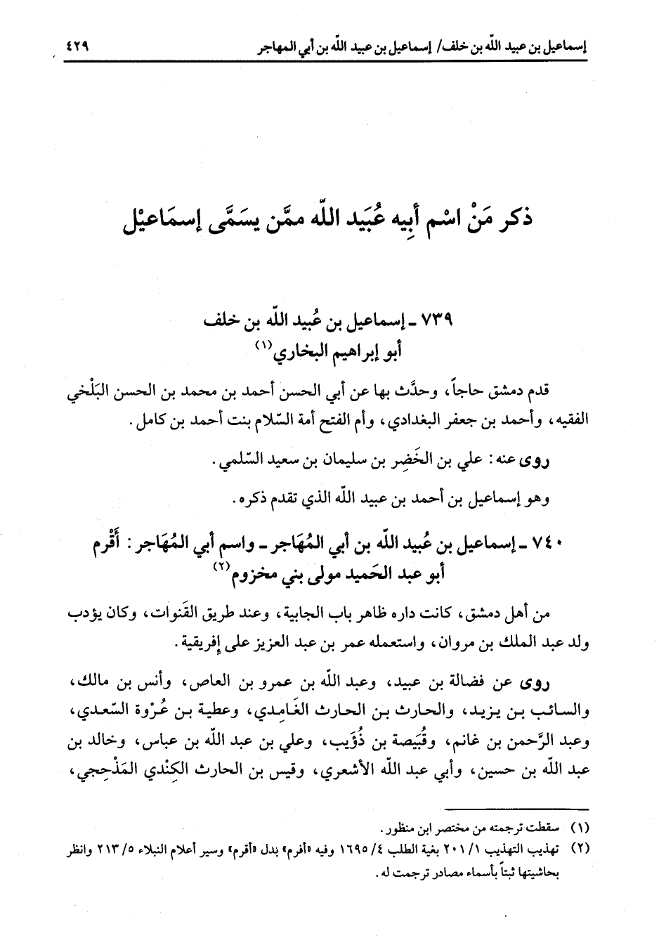 740 - إسماعيل بن عبيد الله بن أبي المهاجر واسم أبي المهاجر أقرم أبو عبد الحميد مولى بني مخزوم (2) من أهل دمشق كانت داره ظاهر باب الجابية وعند طريق القنوات وكان يؤدب ولد عبد الملك بن مروان واستعمله عمر بن عبد العزيز على إفريقية روى عن فضالة بن عبيد وعبد الله بن عمرو بن العاص وأنس بن مالك والسائب بن يزيد والحارث بن الحارث الغامدي وعطية بن عروة السعدي وعبد الرحمن بن غانم وقبيصة بن ذؤيب وعلي بن عبد الله بن عباس وخالد بن عبد الله بن حسين وأبي عبد الله الأشعري وقيس بن الحارث الكندي المذحجي