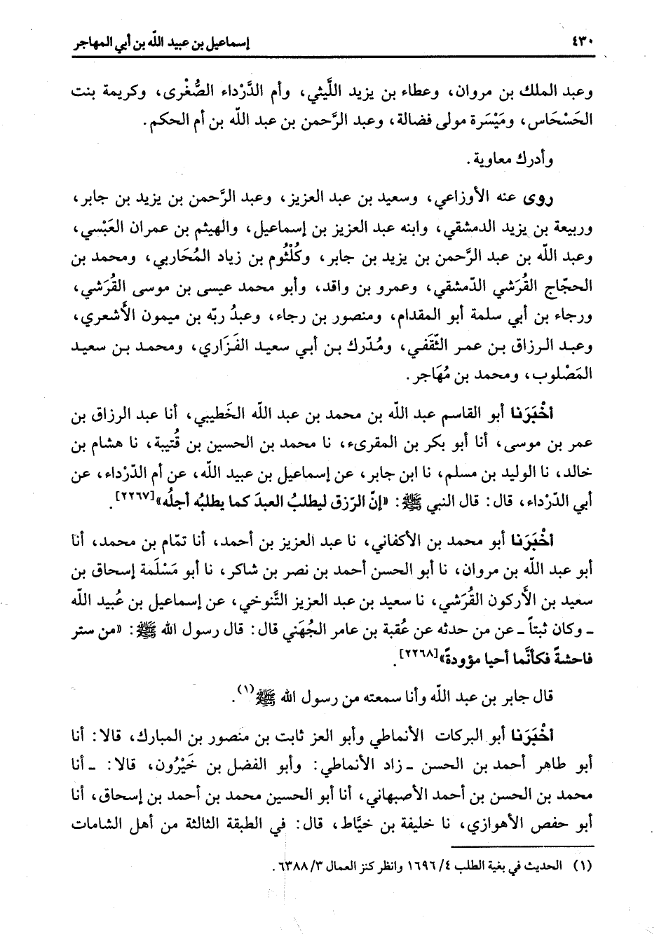وعبد الملك بن مروان وعطاء بن يزيد الليثي وأم الدرداء الصغرى وكريمة بنت الحسحاس وميسرة مولى فضالة وعبد الرحمن بن عبد الله بن أم الحكم وأدرك معاوية روى عن الأوزاعي وسعيد بن عبد العزيز وعبد الرحمن بن يزيد بن جابر وربيعة بن يزيد الدمشقي وابنه عبد العزيز بن إسماعيل والهيثم بن عمران العبسي وعبد الله بن عبد الرحمن بن يزيد بن جابر وكلثوم بن زياد المحاربي ومحمد بن الحجاج القرشي الدمشقي وعمرو بن واقد وأبو محمد عيسى بن موسى القرشي ورجاء بن أبي سلمة أبو المقدام ومنصور بن رجاء وعبد ربه بن ميمون الأشعري وعبد الرزاق بن عمر الثقفي ومدرك بن أبي سعيد الفزاري ومحمد بن سعيد المصلوب ومحمد بن مهاجر أخبرنا أبو القاسم عبد الله بن محمد بن عبد الله الخطيبي أنا عبد الرزاق بن عمر بن موسى أنا أبو بكر بن المقر نا محمد بن الحسين بن قتيبة نا هشام بن خالد نا الوليد بن مسلم نا ابن جابر عن إسماعيل بن عبيد الله عن أم الدرداء عن أبي الدرداء قال قال النبي (صلى الله عليه وسلم) إن الرزق ليطلب العبد كما يطلبه أجله أخبرنا أبو محمد بن الأكفاني نا عبد العزيز بن أحمد أنا تمام بن محمد أنا أبو عبد الله بن مروان نا أبو الحسن أحمد بن نصر بن شاكر نا أبو مسلمة إسحاق بن سعيد بن الأركون القرشي نا سعيد بن عبد العزيز التنوخي عن إسماعيل بن عبيد الله وكان ثبتا عن من حدثه عن عقبة بن عامر الجهني قال قال رسول الله (صلى الله عليه وسلم) من ستر فاحشة فكأنما أحيا مؤودة قال جابر بن عبد الله وأنا سمعته من رسول الله (صلى الله عليه وسلم) (1) أخبرنا أبو البركات الأنماطي وأبو العز ثابت بن منصور بن المبارك قالا أنا أبو طاهر أحمد بن الحسن زاد الأنماطي وأبو الفضل بن خيرون قالا أنا محمد بن الحسن بن أحمد الأصبهاني أنا أبو الحسين محمد بن أحمد بن إسحاق أنا أبو حفص الأهوازي نا خليفة بن خياط قال في الطبقة الثالثة من أهل الشامات