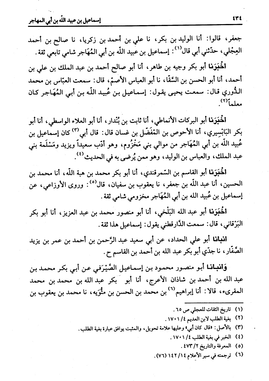 جعفر قالوا أنا الوليد بن بكر نا علي بن أحمد بن زكريا نا صالح بن أحمد العجلي حدثني أبي قال (1) إسماعيل بن عبيد الله بن أبي المهاجر شامي تابعي ثقة أخبرنا أبو بكر وجيه بن طاهر أنا أبو صالح أحمد بن عبد الملك بن علي بن أحمد أنا أبو الحسن بن السقا نا أبو العباس الأصم قال سمعت العباس بن محمد الدوري قال سمعت يحيى يقول إسماعيل بن عبيد الله بن أبي المهاجر كان معلما (2) أخبرنا أبو البركات الأنماطي أنا ثابت بن بندار أنا أبو العلاء الواسطي أنا أبو بكر البابسيري أنا الأحوص بن المفضل بن غسان قال قال أبي (3) كان أبي إسماعيل بن عبيد الله بن أبي المهاجر من موالي بني مخزوم وهو أدب سعيدا ويزيد ومسلمة بني عبد الملك والعباس بن الوليد وهو ممن يرضى به في الحديث (4) أخبرنا أبو القاسم بن السمرقندي أنا أبو بكر محمد بن هبة الله أنا محمد بن الحسين أنا عبد الله بن جعفر نا يعقوب بن سفيان قال (5) وروى الأوزاعي عن إسماعيل بن عبيد الله بن أبي المهاجر مخزومي شامي ثقة أخبرنا أبو عبد الله البلخي أنا أبو منصور محمد بن عبد العزيز أنا أبو بكر البرقاني قال سمعت الدارقطني يقول إسماعيل هذا ثقة أنبأنا أبو علي الحداد عن أبي سعيد عبد الرحمن بن أحمد بن عمر بن يزيد الصفار نا جدي أبو بكر عبد الله بن أحمد بن القاسم وأنبأنا أبو منصور محمود بن إسماعيل الصيرفي عن أبي بكر محمد بن إ عبد الله بن أحمد بن شاذان الأعرج أنا أبو بكر عبد الله بن محمد بن محمد المقرئ قالا أنا إبراهيم (6) بن محمد بن الحسن بن متويه نا محمد بن يعقوب بن