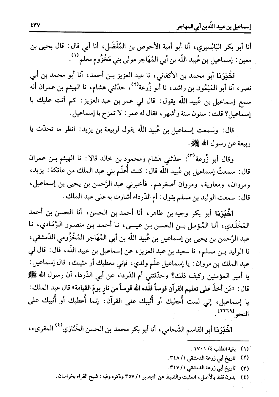 أنا أبو بكر البابسيري أنا أبو أمية الأحوص بن المفضل أنا أبي قال قال يحيى بن معين إسماعيل بن عبيد الله بن أبي المهاجر مولى بني مخزوم معلم (1) أخبرنا أبو محمد بن الأكفاني نا عبد العزيز بن أحمد أنا أبو محمد بن أبي نصر أنا أبو الميمون بن راشد نا أبو زرعة (2) حدثني هشام نا الهيثم بن عمران أنه سمع إسماعيل بن عبيد الله يقول قال لي عمر بن عبد العزيز كم أتت عليك يا إسماعيل قلت ستون سنة وأشهر فقال له عمر لا تمزح يا إسماعيل قال وسمعت إسماعيل بن عبيد الله يقول لربيعة بن يزيد انظر ما تحدث يا ربيعة عن رسول الله (صلى الله عليه وسلم) وقال أبو زرعة (3) حدثني هشام ومحمود بن خالد قالا نا الهيثم بن عمران قال سمعت إسماعيل بن عبيد الله قال كنت أعلم بني عبد الملك من عاتكة يزيد ومروان ومعاوية ومروان أصغرهم فأخبرني عبد الرحمن بن يحيى بن إسماعيل قال سمعت الوليد بن مسلم يقول أم الدرداء أشارت به على عبد الملك أخبرنا أبو بكر وجيه بن طاهر أنا أحمد بن الحسن أنا الحسن بن أحمد المخلدي أنا المؤمل بن الحسن بن عيسى نا أحمد بن منصور الرمادي نا عبد الرحمن بن يحيى بن إسماعيل بن عبيد الله بن أبي المهاجر المخزومي الدمشقي نا الويد بن مسلم نا سعيد بن عبد العزيز عن إسماعيل بن عبيد الله قال قال لي عبد الملك بن مروان يا إسماعيل علم ولدي فإني معطيك أو مثيبك قال إسماعيل يا أمير المؤمنين وكيف ذلك وحدثتني أم الدرداء عن أبي الدرداء أن رسول الله (صلى الله عليه وسلم) قال من أخذ على تعليم القرآن قوسا قلده الله قوسا من نار يوم القيامة قال عبد الملك يا إسماعيل إني لست أعطيك أو أثيبك على القرآن إنما أعطيك أو أثيبك على النحو أخبرنا أبو القاسم الشحامي أنا أبو بكر محمد بن الحسن الخبازي (4) المقرئ