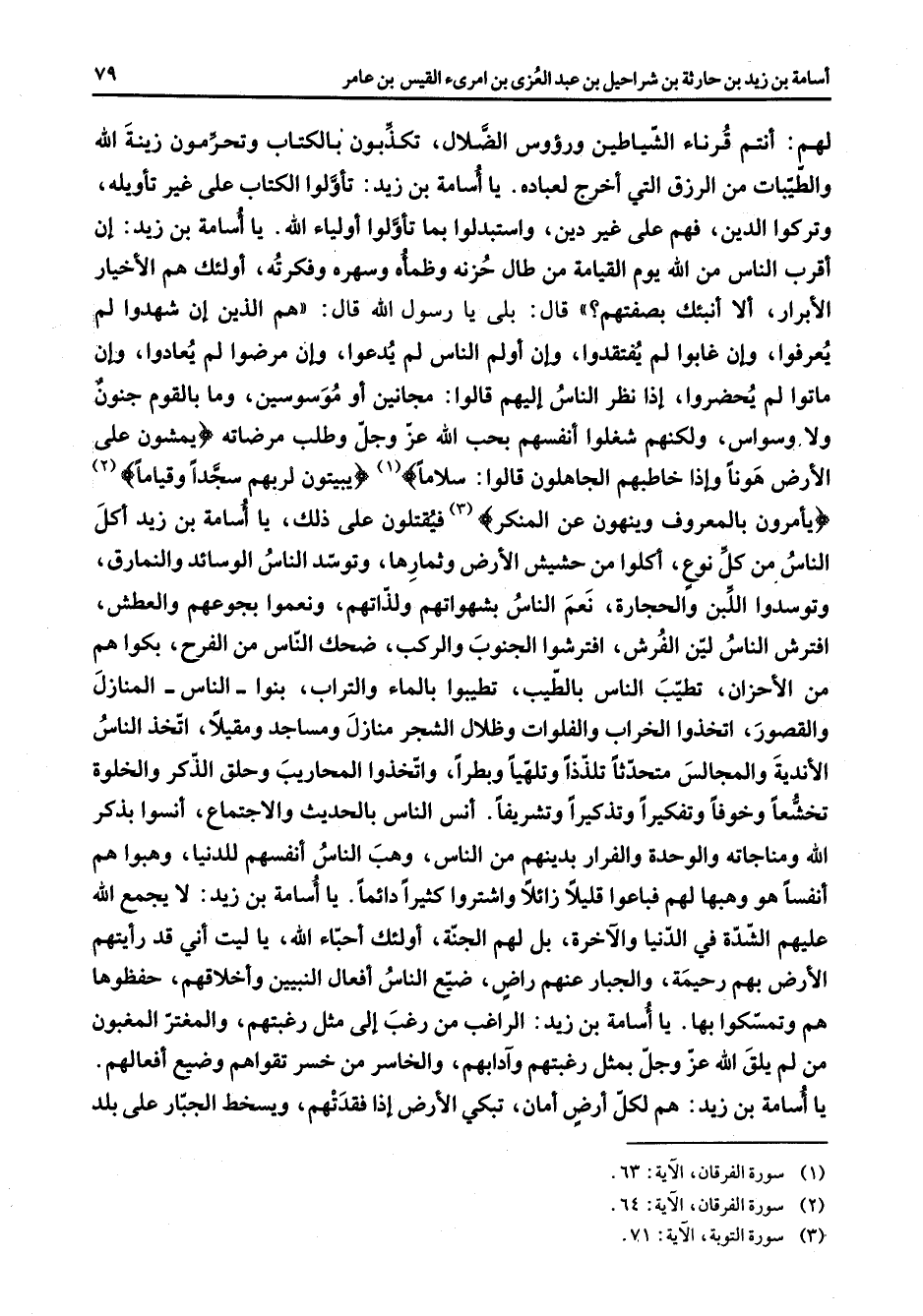 لهم أنتم قرناء الشياطين ورؤوس الضلال تكذبون بالكتاب وتحرمون زينة الله والطيبات من الرزق التي أخرج لعباده يا أسامة بن زيد تأولوا الكتاب على غير تأويله وتركوا الدين فهم على غير دين واستبدلوا بما تأولوا أولياء الله يا أسامة بن زيد إن أقرب الناس من الله يوم القيامة من طال حزمه وظمأه وسهره وفكرته أولئك هم الأخيار الأبرار ألا أنبئك بصفتهم قال بلى يا رسول الله قال هم الذين إن شهدوا لم يعرفوا وإن غابوا لم يفتقدوا وإن أولم الناس لم يدعوا وإن مرضوا لم يعادوا وإن ماتوا لم يحضروا إذا نظر الناس إليهم قالوا مجانين أو موسوسين وما بالقوم جنون ولا وسواس ولكنهم شغلوا أنفسهم بحب الله عز وجل وطلب مرضاته " يمشون على الأرض هونا وإذا خاطبهم الجاهلون قالوا سلاما (1) " " يبيتون لربهم سجدا وقياما (2) " يأمرون بالمعروف وينهون عن المنكر (3) " فيقتلون على ذلك يا أسامة بن زيد أكل الناس من كل نوع أكلوا من حشيش الأرض وثمارها وتوسد الناس الوسائد والنمارق وتوسدوا اللبن والحجارة نعم الناس بشهواتهم ولذاتهم ونعموا بجوعهم والعطش افترش الناس لين الفرش افترشوا الجنوب والركب ضحك الناس من الفرح بكوا هم من الأحزان تطيب الناس بالطيب تطيبوا بالماء والتراب بنوا الناس المنازل والقصور اتخذوا الخراب والفلوات وظلال الشجر منازل ومساجد ومقيلا اتخذ الناس الأندية والمجالس متحدثا تلذذا وتلهيا وبطرا واتخذوا المحاريب وحلق الذكر والخلوة تخشعا وخوفا وتفكيرا وتذكيرا وتشريفا أنس الناس بالحديث والاجتماع أنسوا بذكر الله ومناجاته والوحدة والفرار بدينهم من الناس وهب الناس أنفسهم للدنيا وهبوا هم أنفسا هو وهبها لهم فباعوا قليلا زائلا واشتروا كثيرا دائما يا أسامة بن زيد لا يجمع الله عليهم الشدة في الدنيا والآخرة بل لهم الجنة أولئك أحباء الله يا ليت أني قد رأيتهم الأرض بهم رحيمة والجبار عنهم راض ضيع الناس أفعال النبيين وأخلاقهم حفظوها هم وتمسكوا بها يا أسامة بن زيد الراغب من رغب إلى مثل رغبتهم والمغتر المغبون من لم يلق الله عز وجل بمثل رغبتهم وآدابهم والخاسر من خسر تقواهم وضيع أفعالهم إ يا أسامة بن زيد هم لكل أرض أمان تبكي الأرض إذا فقدتهم ويسخط الجبار على بلد