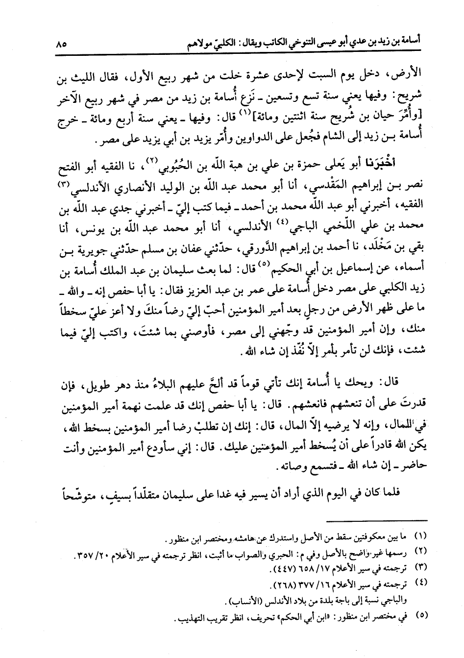 الأرض دخل يوم السبت لإحدى عشرة خلت من شهر ربيع الأول فقال الليث بن شريح وفيها عني سنة تسع وتسعين نزع أسامة بن زيد من مصر في شهر ربيع الآخر وأمر حيان بن شريح سنة اثنتين ومائة (1) قال وفيها يعني سنة أربع ومائة خرج أسامة بن زيد إلى الشام فجعل على الدواوين وأمر يزيد بن أبي يزيد على مصر أخبرنا أبو يعلى حمزة بن علي بن هبة الله بن الحبوبي (2) نا الفقيه أبو الفتح نصر بن إبراهيم المقدسي أنا أبو محمد عبد الله بن الوليد الأنصار الأندلسي (3) الفقيه أخبرني أبو عبد الله محمد بن أحمد فيما كتب إلي أخبرني جدي عبد الله بن محمد بن علي اللخمي الباجي (4) الأندلسي أنا أبو محمد عبد الله بن يونس أنا بقي بن مخلد نا أحمد بن إبراهيم الدورقي حدثني عفان بن مسلم حدثني جويرية بن أسماء عن إسماعيل بن أبي الحكيم (5) قال لما بعث سليمان بن عبد الملك أسامة بن زيد الكلبي على مصر دخل أسامة على عمر بن عبد العزيز فقال يا أبا حفص إنه والله ما على ظهر الأرض من رجل بعد أمير المؤمنين أحب إلي رضا منك ولا أعز علي سخطا منك وإن أمير المؤمنين قد وجهني إلى مصر فأوصني ما شئت واكتب إلي فيما شئت فإنك لن تأمر بأمر إلا نفذ إن شاء الله قال ويحك يا أسامة إنك تأتي قوما قد ألح عليهم البلاء منذ دهر طويل فإن قدرت على أن تنعشهم فانعشهم قال يا أبا حفص إنك قد علمت نهمة أمير المؤمنين في المال وإنه لا يرضيه إلا المال قال إنك إن تطلب رضا أمير المؤمنين بسخط الله يكن الله قادرا على أن يسخط أمير المؤمنين عليك قال إني سأودع أمير المؤمنين وأنت حاضر إن شاء الله فتسمع وصاته فلما كان في اليوم الذي أراد أن يسير فيه غدا على سليمان متقلدا بسيف متوشحا