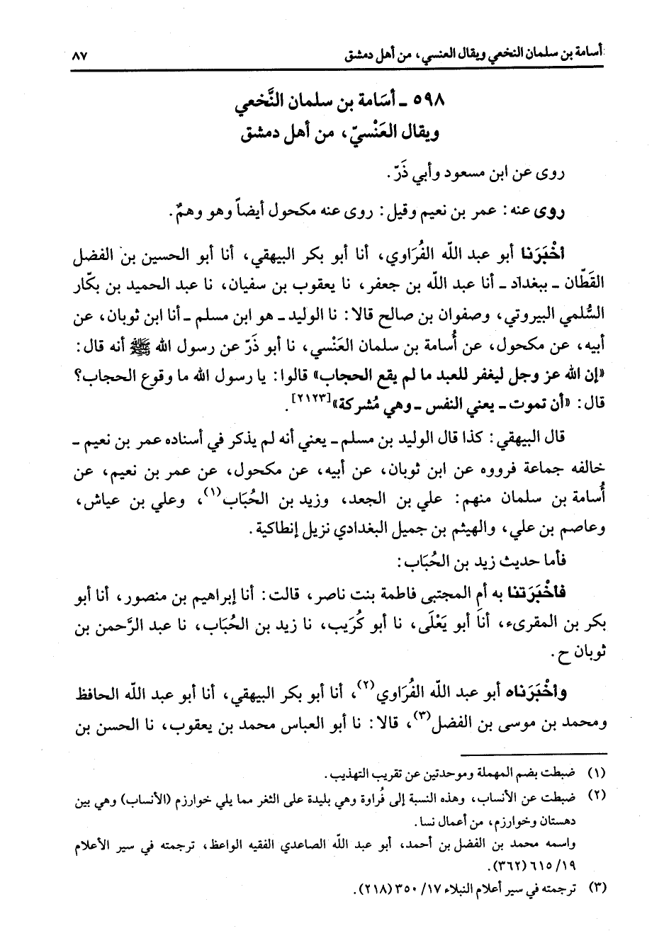 598 - أسامة بن سلمان النخعي ويقال العنسي من أهل دمشق روى عن ابن مسعود وأبي ذر روى عنه عمر بن نعيم وقيل روى عنه مكحول أيضا وهو وهم أخبرنا أبو عبد الله الفراوي أنا أبو بكر البيهقي أنا أبو الحسين بن الفضل القطان ببغداد أنا عبد الله بن جعفر نا يعقوب بن سفيان نا عبد الحميد بن بكار السلمي البيروتي وصفوان بن صالح قالا نا الوليد هو ابن مسلم أنا ابن ثوبان عن أبيه عن مكحول عن أسامة بن سلمان العنسي نا أبو ذر عن رسول الله صلى الله عليه وسلم) أنه قال إن الله عز وجل ليغفر للعبد ما لم يقع الحجاب قالوا يا رسول الله ما وقوع الحجاب قال أن تموت يعني النفس وهي مشركة