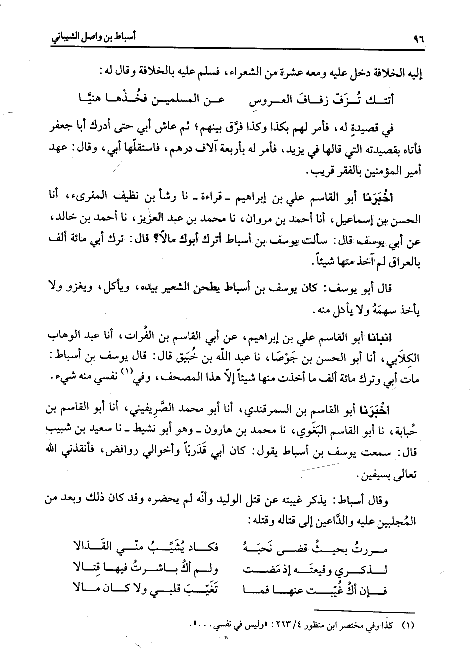 إليه الخلافة دخل عليه ومعه عشرة من الشعراء فسلم عليه بالخلافة وقال له أتتك تزف زفاف العروس * عن المسلمين فخذها هنيا * في قصيدة له فأمر لهم بكذا وكذا فرق بينهم ثم عاش أبي حتى أدرك أبا جعفر فأتاه بقصيدته التي قالها في يزيد فأمر له بأربعة آلاف درهم فاستقلها أبي وقال عهد إ أمير المؤمنين بالفقر قريب أخبرنا أبو القاسم علي بن إبراهيم قراءة نا رشأ بن نظيف المقرئ أنا الحسن بن إسماعيل أنا أحمد بن مروان نا محمد بن عبد العزيز نا أحمد بن خالد عن أبي يوسف قال سألت يوسف بن أسباط أترك أبوك مالا قال ترك أبي مائة ألف إ بالعراق لم آخذ منها شيئا قال أبو يوسف كان يوسف بن أسباط يطحن الشعير بيده ويأكل ويغزو ولا يأخذ سهمه ولا يأكل منه أنبأنا أبو القاسم علي بن إبراهيم عن أبي القاسم بن الفرات أنا عبد الوهاب الكلابي أنا أبو الحسن بن جوصا نا عبد الله بن خبيق قال قال يوسف بن أسباط مات أبي وترك مائة ألف ما أخذت منها شيئا إلا هذا المصحف وفي (1) نفسي منه شئ أخبرنا أبو القاسم بن السمرقندي أنا أبو محمد الصريفيني أنا أبو القاسم بن حبابة نا أبو القاسم البغوي نا محمد بن هارون وهو أبو نشيط نا سعيد بن شبيب قال سمعت يوسف بن أسباط يقول كان أبي قدريا وأخوالي روافض فأنقذني الله تعالى بسيفين وقال أسباط يذكر غيبته عن قتل الوليد وأنه لم يحضره وقد كان ذلك وبعد من المجلبين عليه والداعين إلى قتاله وقتله مررت بحيث قضى نحبه * فكاد يشيب مني القذالا لذكري وقيعته إذ مضت * ولم أك باشرت فيها قتالا فإن أك غيبت عنها فما * تغيب قلبي ولا كان مالا