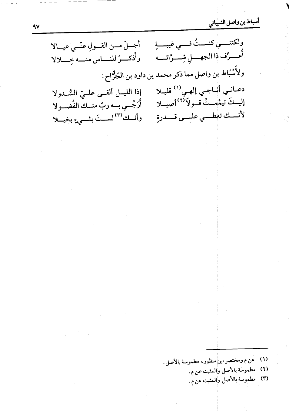 ولكنني كنت في غيبة * أجل من القول عني عيالا أعرف ذا الجهل شراته * وأذكر للناس منه خلالا * ولأسباط بن واصل مما ذكر محمد بن داود بن الجراح دعاني أناجي إلهي (1) قليلا * إذا الليل ألقى علي السدولا إليك تيممت قولا (2) أصيلا * أرجي به رب منك الفضولا لأنك تعطي على قدرة * وأنك (3) لست بشئ بخيلا