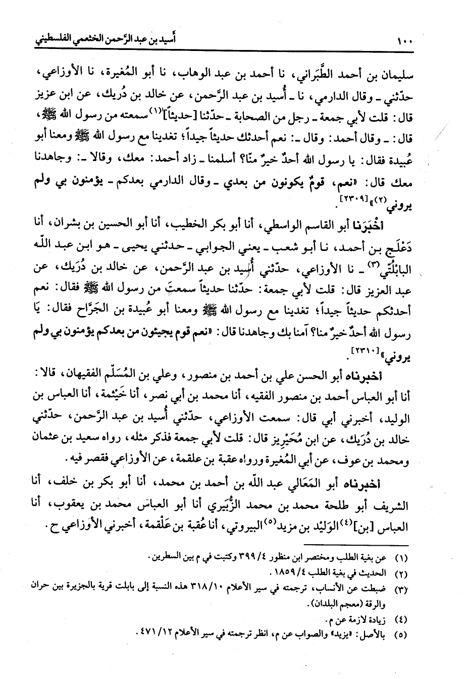 سليمان بن أحمد الطبراني نا أحمد بن عبد الوهاب نا أبو المغيرة نا الأوزعي حدثني وقال الدارمي نا أسيد بن عبد الرحمن عن خالد بن دريك عن ابن عزيز قال قلت لأبي جمعة رجل من الصحابة حدثنا حديثا (1) سمعته من رسول الله (صلى الله عليه وسلم) قال وقال أحمد وقال نعم أحدثك حديثا جيدا تغدينا مع رسول الله (صلى الله عليه وسلم) ومعنا أبو عبيدة فقال يا رسول الله أحد خير منا أسلمنا زاد أحمد معك وقالا وجاهدنا معك قال نعم قوم يكونون من بعدي وقال الدارمي بعدكم يؤمنون بي ولم يروني (2) أخبرنا أبو القاسم الواسطي أنا أبو بكر الخطيب أنا أبو الحسين بن بشران أنا دعلج بن أحمد نا أبو شعب يعني الجوابي حدثني يحيى هو ابن عبد الله البابلتي (3) نا الأوزاعي حدثني أسيد بن عبد الرحمن عن خالد بن دريك عن عبد العزيز قال قلت لأبي جمعة حدثنا حديثا سمعت من رسول الله (صلى الله عليه وسلم) فقال نعم أحدثكم حديثا جيدا تغدينا مع رسول الله (صلى الله عليه وسلم) ومعنا أبو عبيدة بن الجراح فقال يا رسول الله أحد خير منا آمنا بك وجاهدنا قال نعم قوم يجيئون من بعدكم يؤمنون بي ولم يروني أخبرناه أبو الحسن علي بن أحمد بن منصور وعلي بن المسلم الفقيهان قالا أنا أبو العباس أحمد بن منصور الفقيه أنا محمد بن أبي نصر أنا خيثمة أنا العباس بن الوليد أخبرني أبي قال سمعت الأوزاعي حدثني أسيد بن عبد الرحمن حدثني خالد بن دريك عن أبن محيريز قال قلت لأبي جمعة فذكر مثله رواه سعيد بن عثمان ومحمد بن عوف عن أبي المغيرة ورواه عقبة بن علقمة عن الأوزاعي فقصر فيه أخبرناه أبو المعالي عبد الله بن أحمد بن محمد أنا أبو بكر بن خلف أنا الشريف أبو طلحة محمد بن محمد الزبيري أنا أبو العباس محمد بن يعقوب أنا العباس بن (4) الوليد بن مزيد (5) البيروتي أنا عقبة بن علقمة أخبرني الأوزاعي