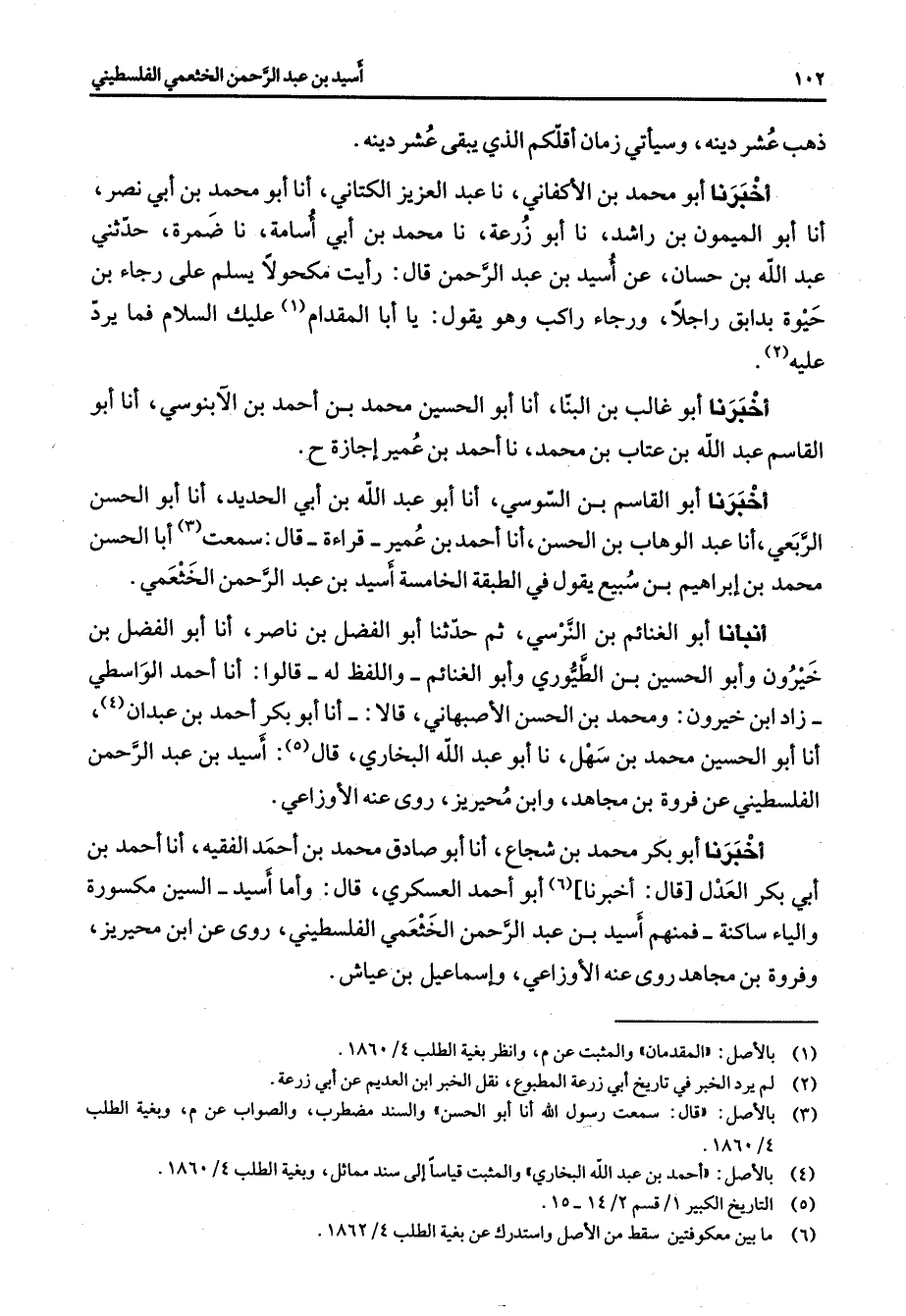 ذهب عشر دينه وسيأتي زمان أقلكم الذي يبقى عشر دينه أخبرنا أبو محمد بن الأكفاني نا عبد العزيز الكتاني أنا أبو محمد بن أبي نصر أنا أبو الميمون بن راشد نا أبو زرعة نا محمد بن أبي أسامة نا ضمرة حدثني عبد الله بن حسان عن أسيد بن عبد الرحمن قال رأيت مكحولا يسلم على رجاء بن حيوة بدابق راجلا ورجاء راكب وهو يقول يا أبا المقدام (1) عليك السلام فما يرد عليه (2) أخبرنا أبو غالب بن البنا أنا أبو الحسين محمد بن أحمد بن الآبنوسي أنا أبو القاسم عبد الله بن عتاب بن محمد نا أحمد بن عمير إجازة أخبرنا أبو القاسم بن السوسي أنا أبو عبد الله بن أبي الحديد أنا أبو الحسن الربعي أنا عبد الوهاب بن الحسن أنا أحمد بن عمير قراءة قال سمعت (3) أبا الحسن محمد بن إبراهيم بن سبيع يقول في الطبقة الخامسة أسيد بن عبد الرحمن الخثعمي أنبأنا أبو الغنائم بن النرسي ثم حدثنا أبو الفضل بن ناصر أنا أبو الفضل بن خيرون وأبو الحسين بن الطيوري وأبو الغنائم واللفظ له قالوا أنا احمد الواسطي زاد ابن خيرون ومحمد بن الحسن الأصبهاني قالا أنا أبو بكر أحمد بن عبدان (4) أنا أبو الحسين محمد بن سهل نا أبو عبد الله البخاري قال (5) أسيد بن عبد الرحمن الفلسطيني عن فروة بن مجاهد وابن محيريز روى عنه الأوزاعي أخبرنا أبو بكر محمد بن شجاع أنا أبو صادق محمد بن أحمد الفقيه أنا أحمد بن أبي بكر العدل قال أخبرنا (6) أبو أحمد العسكري قال وأما أسيد السين مكسورة والياء ساكنة فمنهم أسيد بن عبد الرحمن الخثعمي الفلسطيني روى عن ابن محيريز وفروة بن مجاهد روى عنه الأوزاعي وإسماعيل بن عياش