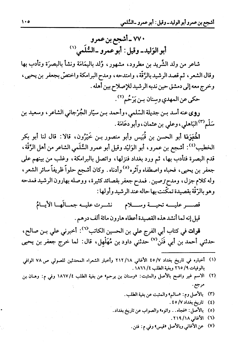 770 - أشجع بن عمرو أبو الوليد وقيل أبو عمرو السلمي (1) شاعر من ولد الشريد بن مطرود مشهور ولد باليمامة ونشأ بالبصرة وتأدب بها وقال الشعر ثم قصد الرشيد بالرقة وامتدحه ومدح البرامكة واختص بجعفر بن يحيى وخرج معه إلى دمشق حين ندبه الرشيد للإصلاح بين أهله حكى عن المهدي وسنان بن يرحم (2) روى عنه أسد بن جديلة السلمي وأحمد بن سيار الجرجاني الشاعر وسعيد بن سلم (3) الباهلي وعلي بن عثمان وأبو دعامة أخبرنا أبو الحسن بن قبيس وأبو منصور بن خيرون قالا قال لنا أبو بكر الخطيب (4) أشجع بن عمرو أبو الوليد وقيل أبو عمرو السلمي الشاعر من أهل الرقة قدم البصرة فتأدب بها ثم ورد بغداد فنزلها واتصل بالبرامكة وغلب من بينهم على جعفر بن يحيى فحباه واصطفاه وآثره (5) وأدناه وكان أشجع حلوا ظريفا سائر الشعر وله كلام جزل ومدح رصين فمدح جعفر بقصائد كثيرة ووصله بهارون الرشيد فمدحه وهو بالرقة بقصيدة تمكنت بها حاله عند الرشيد وأولها * قصر عليه تحية وسلام * نشرت عليه جمالها الأيام * قيل أنه لما أنشد هذه القصيدة أعطاه هارون مائة ألف درهم قرأت في كتاب أبي الفرج علي بن الحسين الكاتب (6) أخبرني علي بن صالح حدثني أحمد بن أبي فنن (7) حدثني داود بن مهلهل قال لما خرج جعفر بن يحيى