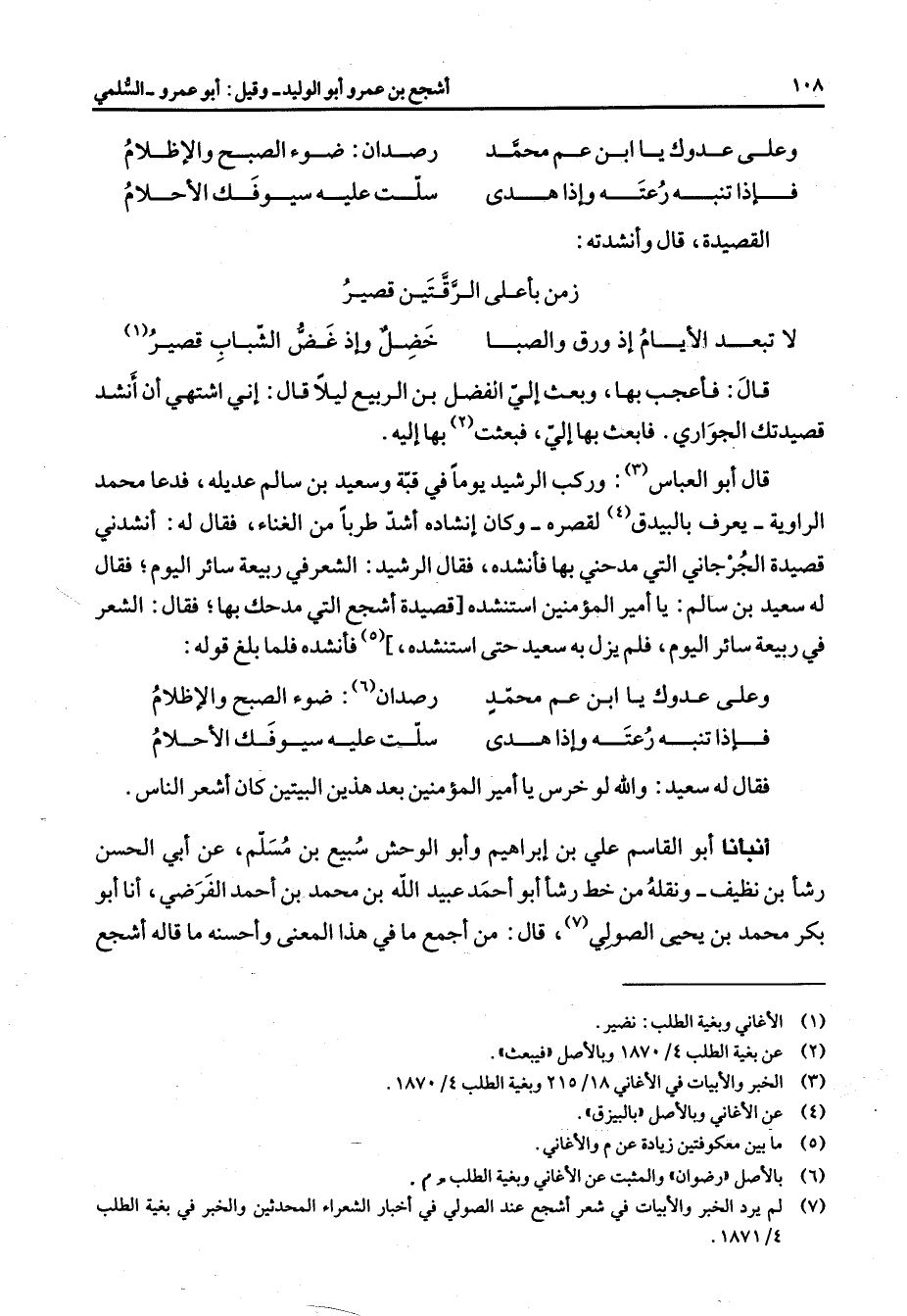 (7) لم يرد الخبر والأبيات في شعر أشجع عند الصولي في أخبار الشعراء المحدثين والخبر في بغية الطلب 4 / 1871