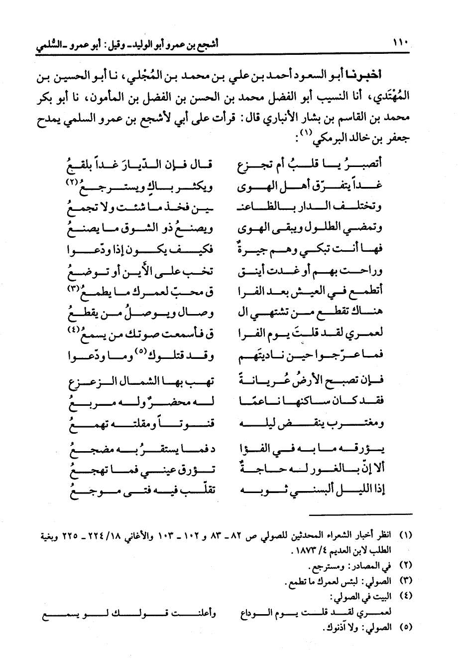 أخبرنا أبو السعود أحمد بن علي بن محمد بن المجلي نا أبو الحسين بن المهتدي أنا النسيب أبو الفضل محمد بن الحسن بن الفضل بن المأمون نا أبو بكر محمد بن القاسم بن بشار الأنباري قال قرأت على أبي لأشجع بن عمرو السلمي يمدح جعفر بن خالد البرمكي (1) * أتصبر يا قلب أم تجزع * قال فإن الديار غدا بلقع غدا يتفرق أهل الهوى * ويكثر باك ويسترجع (2) * وتختلف الدار بالظاعن * ين فخذ ما شئت ولا تجمع وتمضي الطلول ويبقى الهوى * ويصنع ذو الشوق ما يصنع فها أنت تبكي وهم جيرة * فكيف يكون إذا ودعوا وراحت بهم أو غدت أينق * تخب على الأين أو توضع أتطمع في العيش بعد الفرا * ق محب لعمرك ما يطمع (3) هناك تقطع من تشتهي ال * وصال ويوصل من يقطع لعمري لقد قلت يوم الفرا * ق فأسمعت صوتك من يسمع (4) فما عرجوا حين ناديتهم * وقد قتلوك (5) وما ودعوا فإن تصبح الأرض عريانة * تهب بها الشمال الزعزع فقد كان ساكنها ناعما * له محضر وله مربع ومغترب ينقض ليله * قنوتا ومقلته تهمع يؤرقه ما به في الفؤا * د فما يستقر به مضجع ألا إن بالغور له حاجة * تؤرق عيني فما تهجع إذا الليل ألبسني ثوبه * تقلب فيه فتى موجع