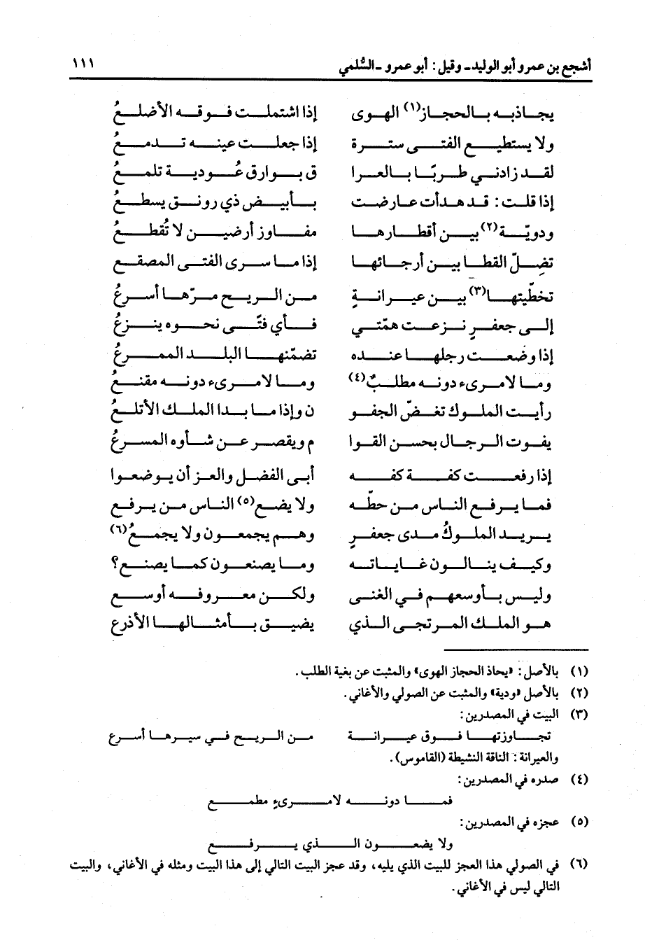 يجاذبه بالحجاز (1) الهوى * إذا اشتملت فوقه الأضلع ولا يستطيع الفتى سترة * إذا جعلت عينه تدمع لقد زادني طربا بالعرا * ق بوارق عودية تلمع إذا قلت قد هدأت عارضت * بأبيض ذي رونق يسطع ودوية (2) بين أقطارها * مفاوز أرضين لا تقطع تضل القطا بين أرجائها * إذا ما سرى الفتى المصقع تخطيتها (3) بين عيرانة * من الريح مرها أسرع إلى جعفر نزعت همتي * فأي فتى نحوه ينزع إذا وضعت رجلها عنده * تضمنها البلد الممرع وما لامرئ دونه مطلب (4) * وما لامرئ دونه مقنع رأيت الملوك تغض الجفو * ن وإذا ما بدا الملك الأتلع يفوت الرجال بحسن القوا * م ويقصر عن شأوه المسرع إذا رفعت كفة كفه * أبى الفضل والعز أن يوضعوا فما يرفع الناس من حطه * ولا يضع (5) الناس من يرفع يريد الملوك مدى جعفر * وهم يجمعون ولا يجمع (6) وكيف ينالون غاياته * وما يصنعون كما يصنع وليس بأوسعهم في الغنى * ولكن معروفه أوسع هو الملك المرتجى الذي * يضيق بأمثالها الأذرع