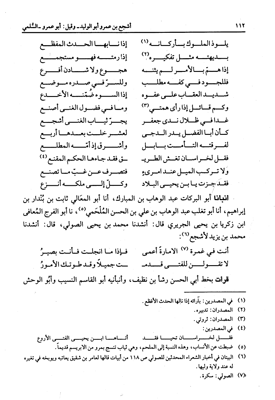 يلوذ الملوك بأركانه (1) * إذا نابها الحدث المفظع بديهته مثل تفكيره (2) * إذا رمته فهو مستجمع إذا هم بالأمر لم يثنه * هجوع ولا شادن أفرع فللجود في كفه مطلب * وللسرفي صدره موضع شديد العقاب على عفوه * إذا السوء ضمنه الأخدع وكم قائل إذا رأى همتي (3) * وما في فضول الغنى أصنع غدا في ظلال ندى جعفر * يجر ثياب الغنى أشجع كأن أبا الفضل يدر الدجى * لعشر خلت بعدها أربع لفرقته التأمت بابل * وأشرق إذ أمه المطلع فقل لخراسان تغش الطري * ق فقد جاءها الحكم المقنع (4) ولا تركب الميل عند امرئ * فتصرف عن غب ما تصنع فقد جزت يا بن يحيى البلاد * وكل إلى ملكه أنزع * أنبأنا أبو البركات عبد الوهاب بن المبارك أنا أبو المعالي ثابت بن بندار بن إبراهيم أنا أبو تغلب عبد الوهاب بن علي بن الحسن الملحمي (5) نا أبو الفرج المعافى ابن زكريا بن يحيى الجريري قال أنشدنا محمد بن يحيى الصولي قال أنشدنا محمد بن يزيد لأشجع (6) * أنت في غمرة (7) الإمارة أعمى * فإذا ما انجلت فأنت بصير لا تقولن للفتى قدم * ت جميلا وقد طوتك الأمور * قرأت بخط أبي الحسن رشأ بن نظيف وأنبأنيه أبو القاسم النسيب وأبو الوحش