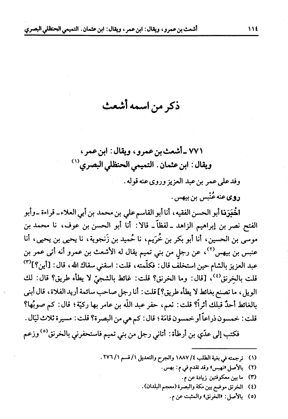 771 - أشعث بن عمرو ويقال ابن عمر ويقال ابن عثمان التميمي الحنظلي البصري (1) وفد على عمر بن عبد العزيز وروى عنه قوله روى عنه عنبس بن بيهس اخبرنا أبو الحسن الفقيه أنا أبو القاسم علي بن محمد بن أبي العلاء قراءة وأبو الفتح نصر بن إبراهيم الزاهد لفظا قالا أنا أبو الحسن بن عوف نا محمد بن موسى بن الحسين أنا أبو بكر بن خريم نا حميد بن زنجويه نا يحيى بن يحيى أنا عنبس بن بيهس (2) عن رجل من بني تميم يقال له الأشعث بن عمرو أنه أتى عمر بن عبد العزيز بالشام حين استخلف قال فكلمته قلت اسقني سقاك الله قال أين (3) قلت بالخرنق قال وما الخرنق (4) قلت غائط بالشجي لا يطأه طريق قال لك الويل ما تصنع بغائط لا يطأه طريق قلت أنا رجل صاحب سائمة أريد الفلاة قال أبنى بالغائط أحد قبلك أثرا قلت نعم حفر عبد الله بن عامر بها ركية قال كم صوبها قلت خمسون ذراعا أو خمسون قامة قال كم هي من البصرة قلت مسيرة ثلاث ليال فكتب إلى عدي بن أرطأة أتاني رجل من بني تميم فاستحفرني بالخرنق (5) وزعم